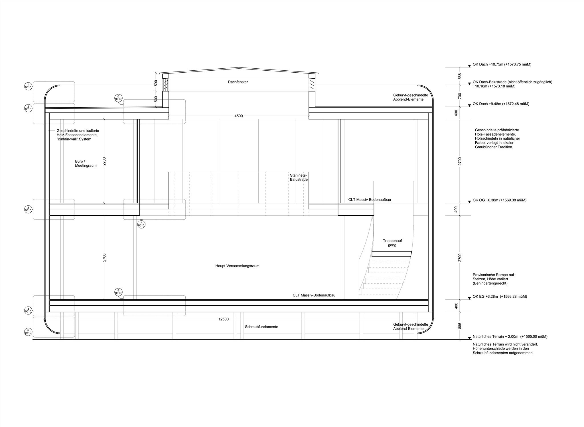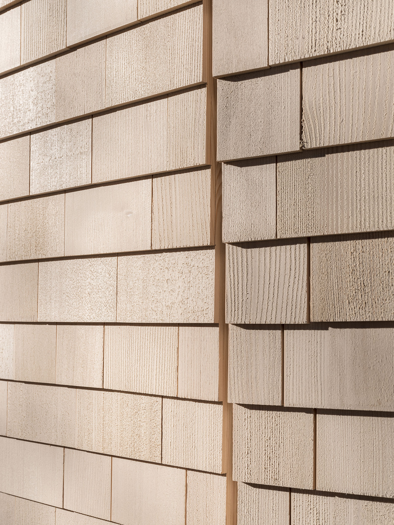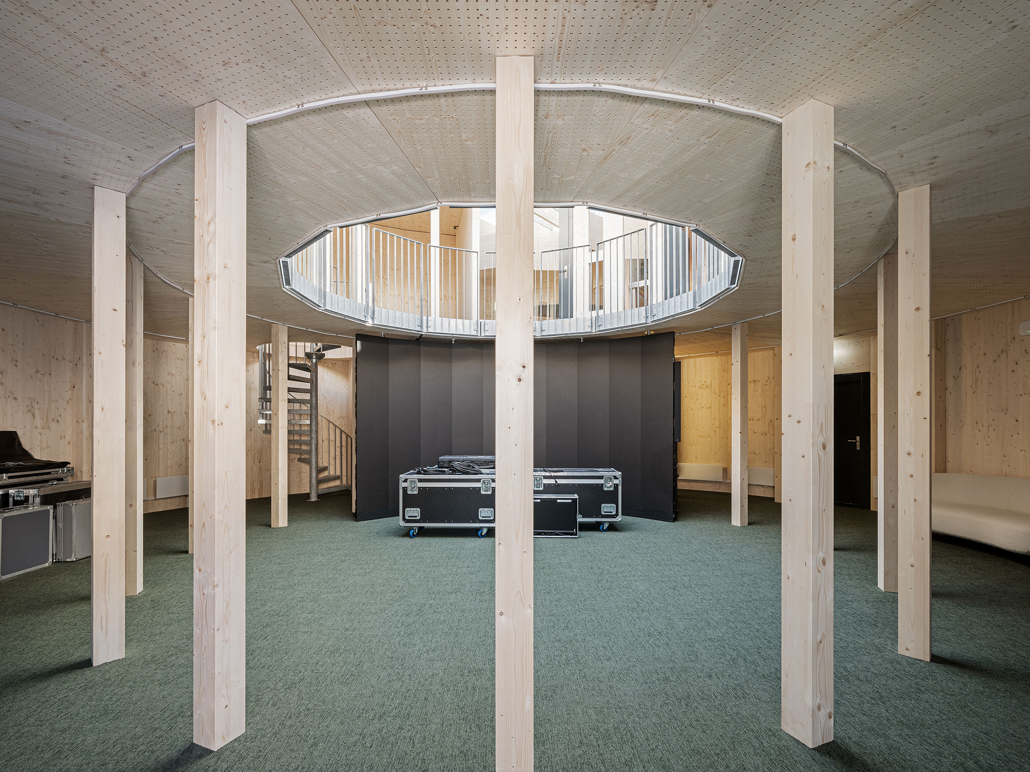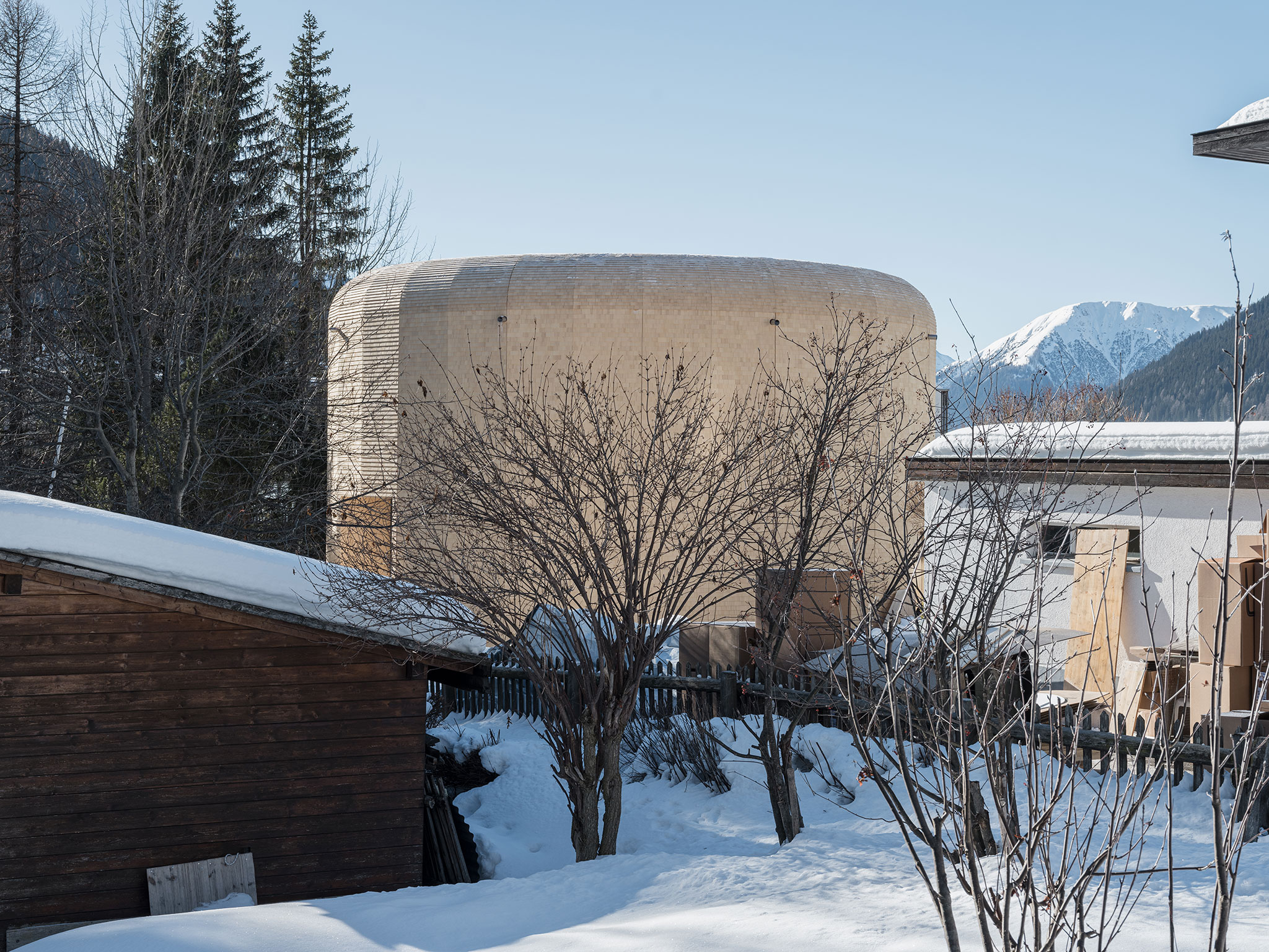 The primary material used is local Swiss wood, which insulates and ventilates the building for greater energy efficiency. On the exterior, the wood is used in the form of untreated shingles, symbolizing aging and change over time. For the foundation, Skrein Studios used screw piles to minimize footprints when dismantled. The building also features fast charging for electric vehicles, edge computing, and community spaces.