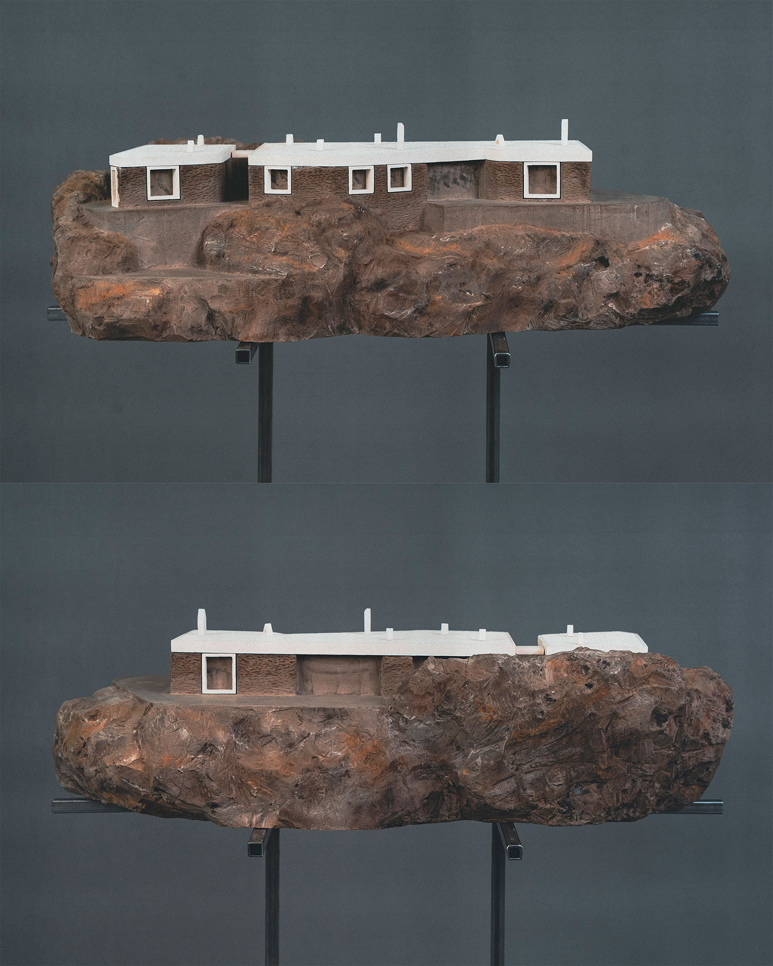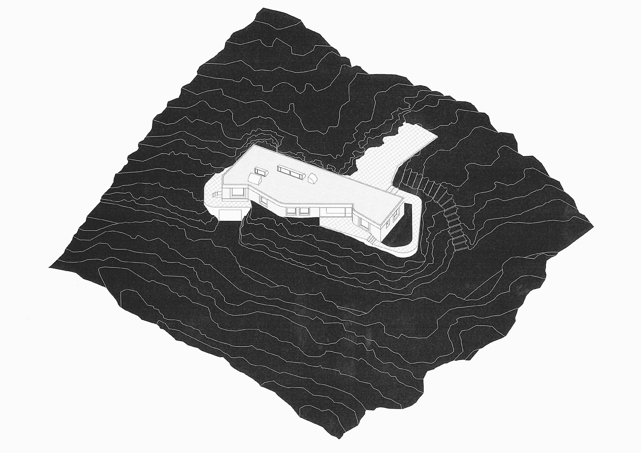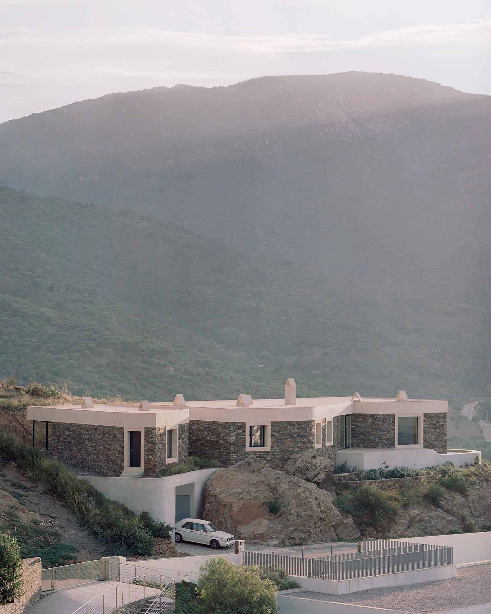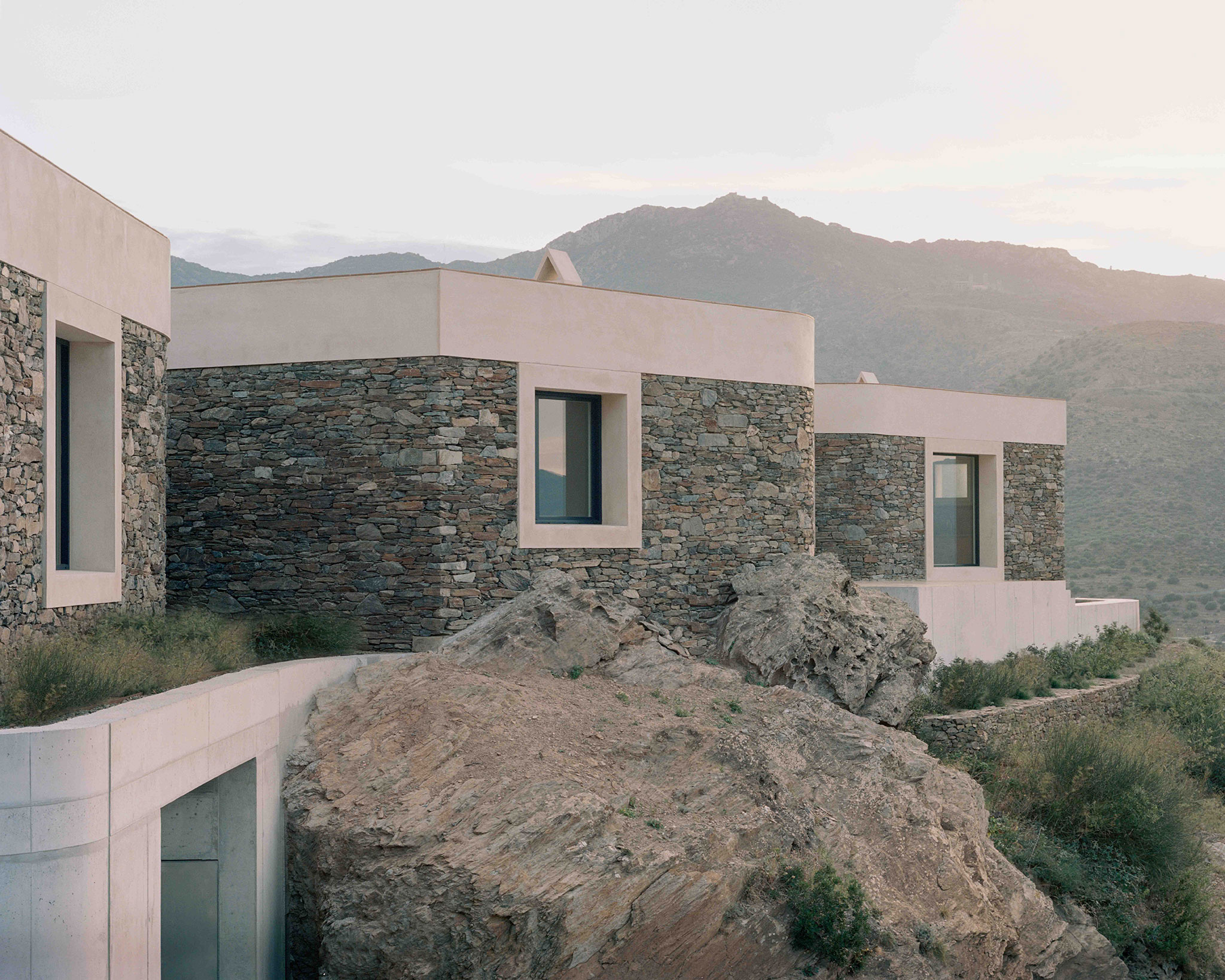 The façade follows the natural geometry of the topography and existing rocks, adapting to the relief and fragmenting to generate multiple orientations and views. Each interior space establishes a specific relationship with its surroundings, opening selectively toward the natural park, the sea, or the nearby village.