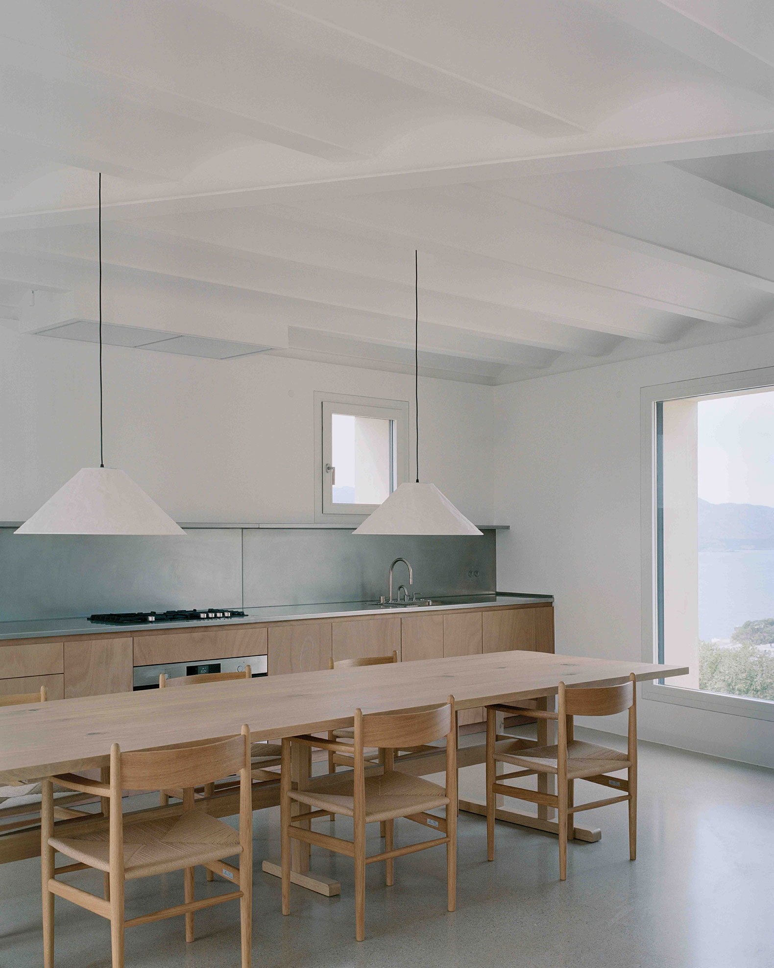 In contrast to the mineral, site-anchored exterior, the interior is defined by an essential Mediterranean language. Spaces seek light, continuity, and calm, creating a serene domestic atmosphere that emphasizes the relationship with the outdoors. The contrast between a tectonic exterior and a bright, restrained interior reinforces the sense of refuge and the transition between landscape and dwelling.