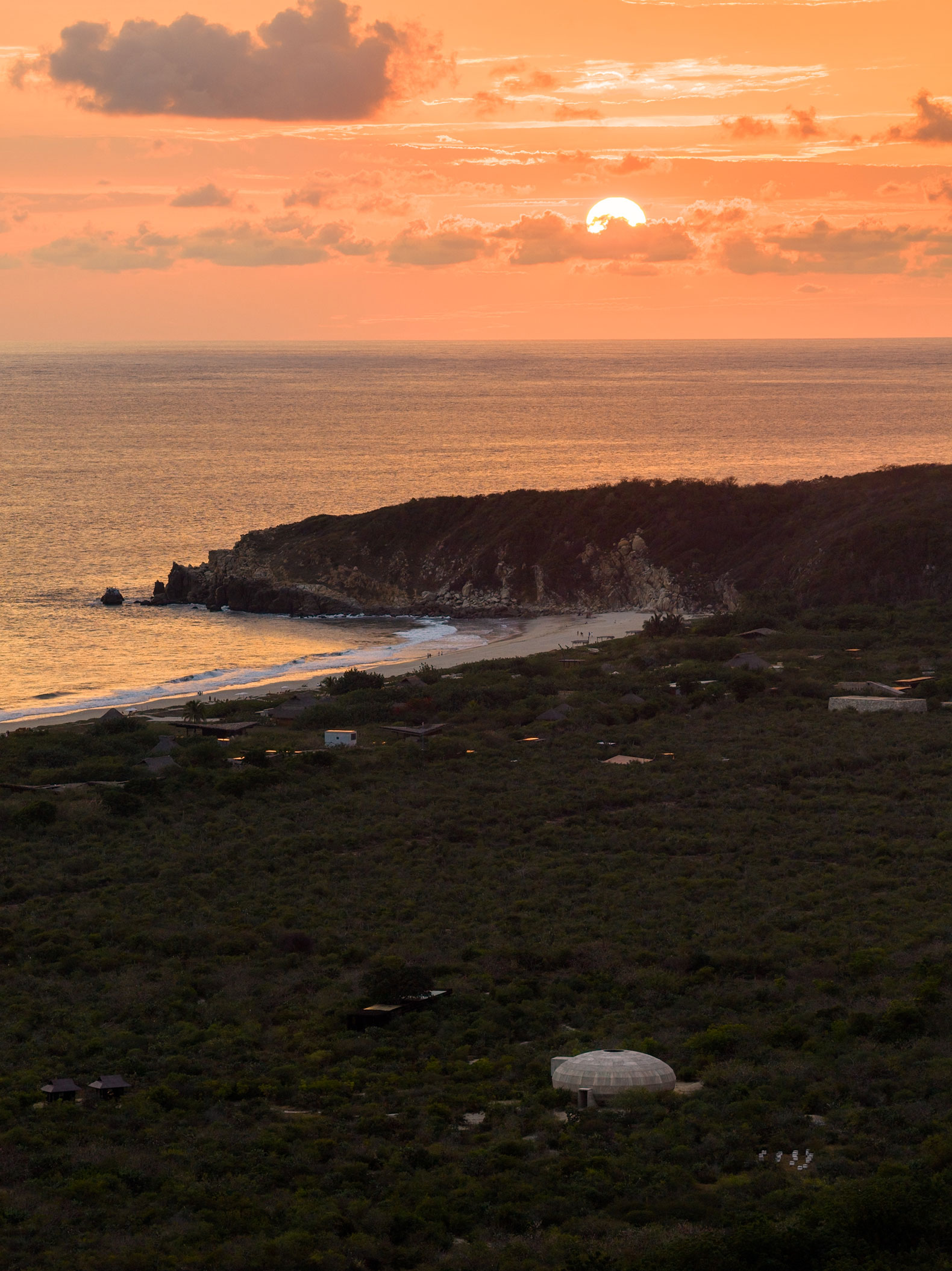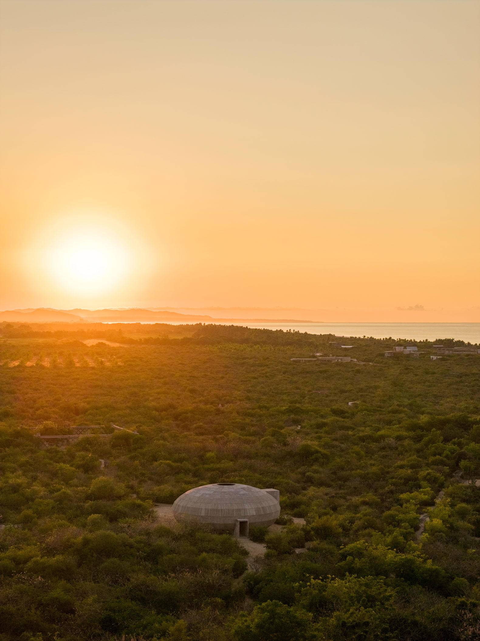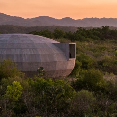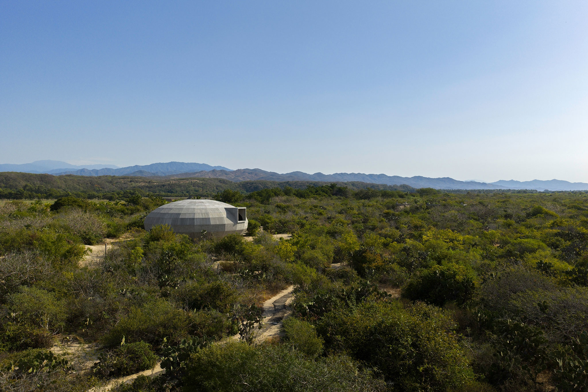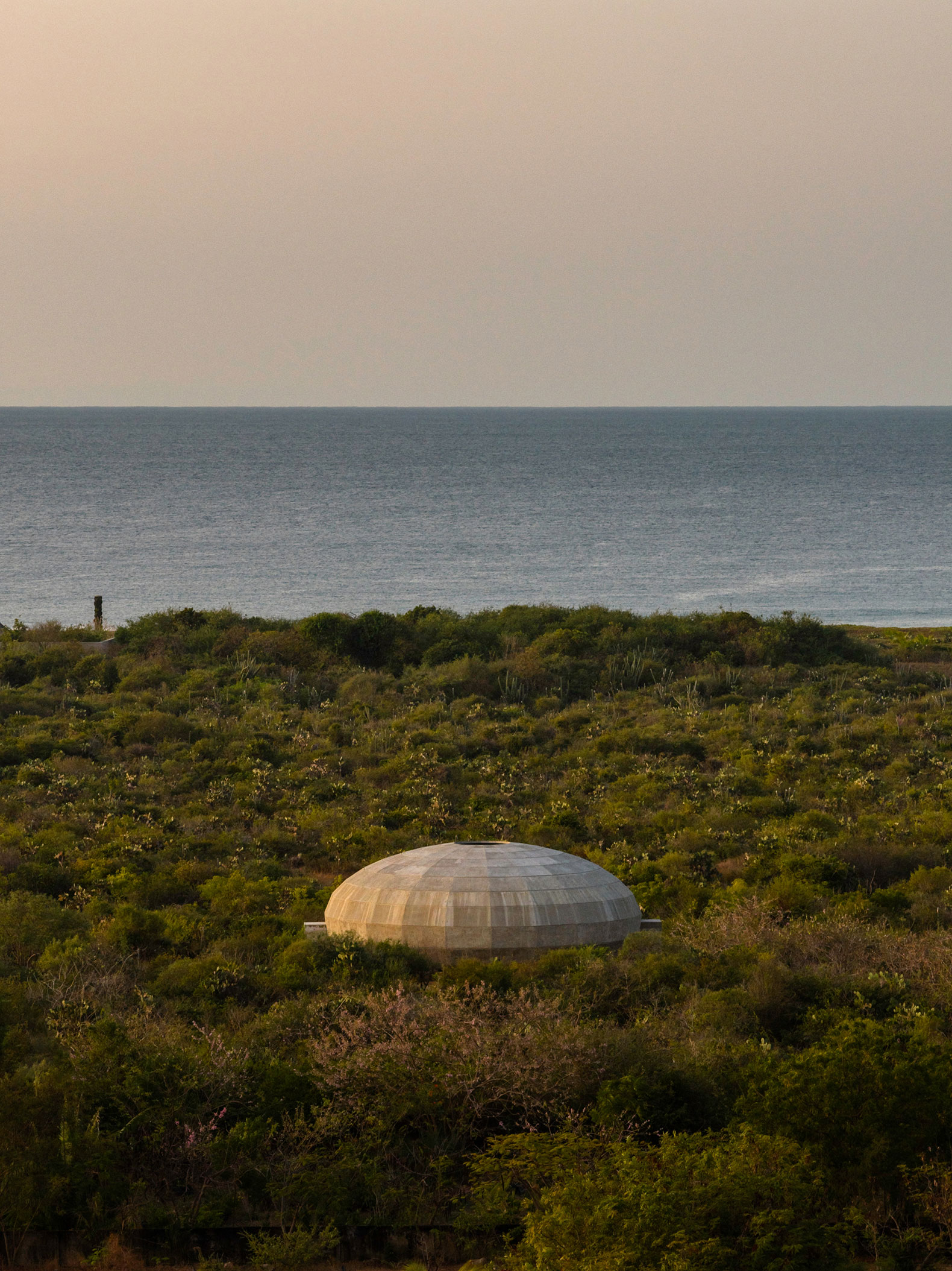 An oculus opens up the central space to the sky and fills the cave-like interior with light, while additional openings around the lower perimeter enable natural ventilation. A platform and portal at the top of the steps offer views above and beyond the natural brush to the ocean. The three-dimensional volume curves inward at its base to minimize the pavilion’s contact on the ground, preserving the natural landscape as much as possible and allowing the native guayacan to thrive.