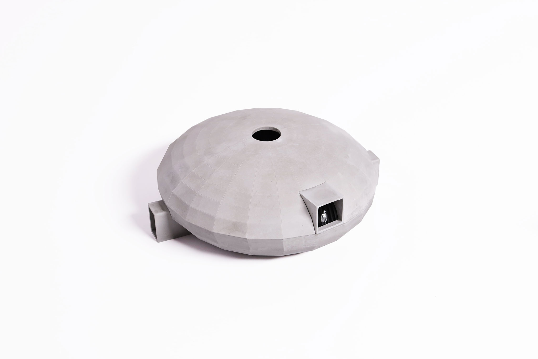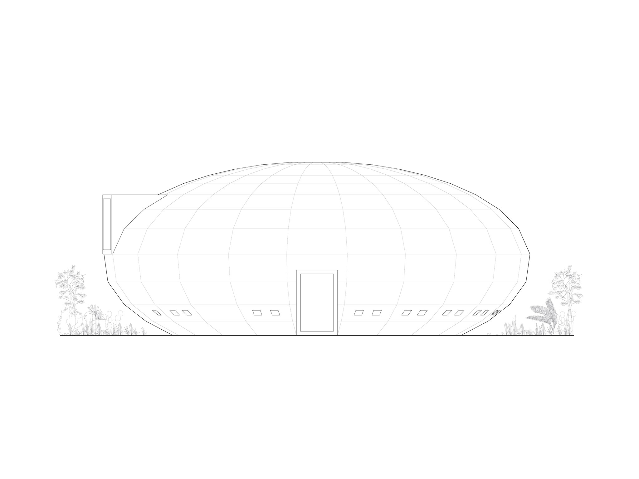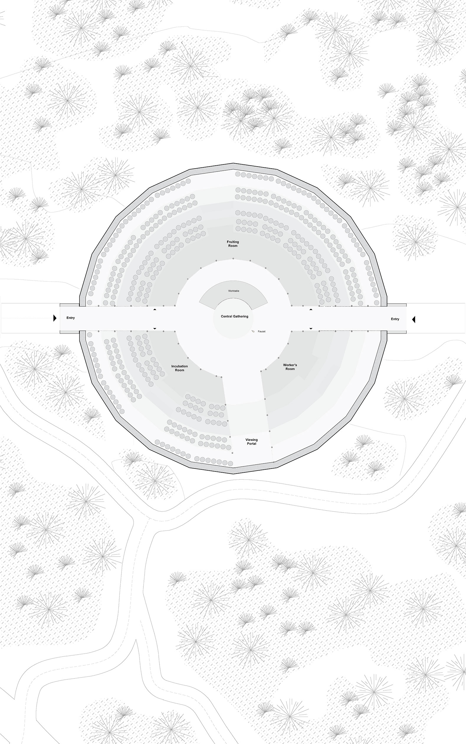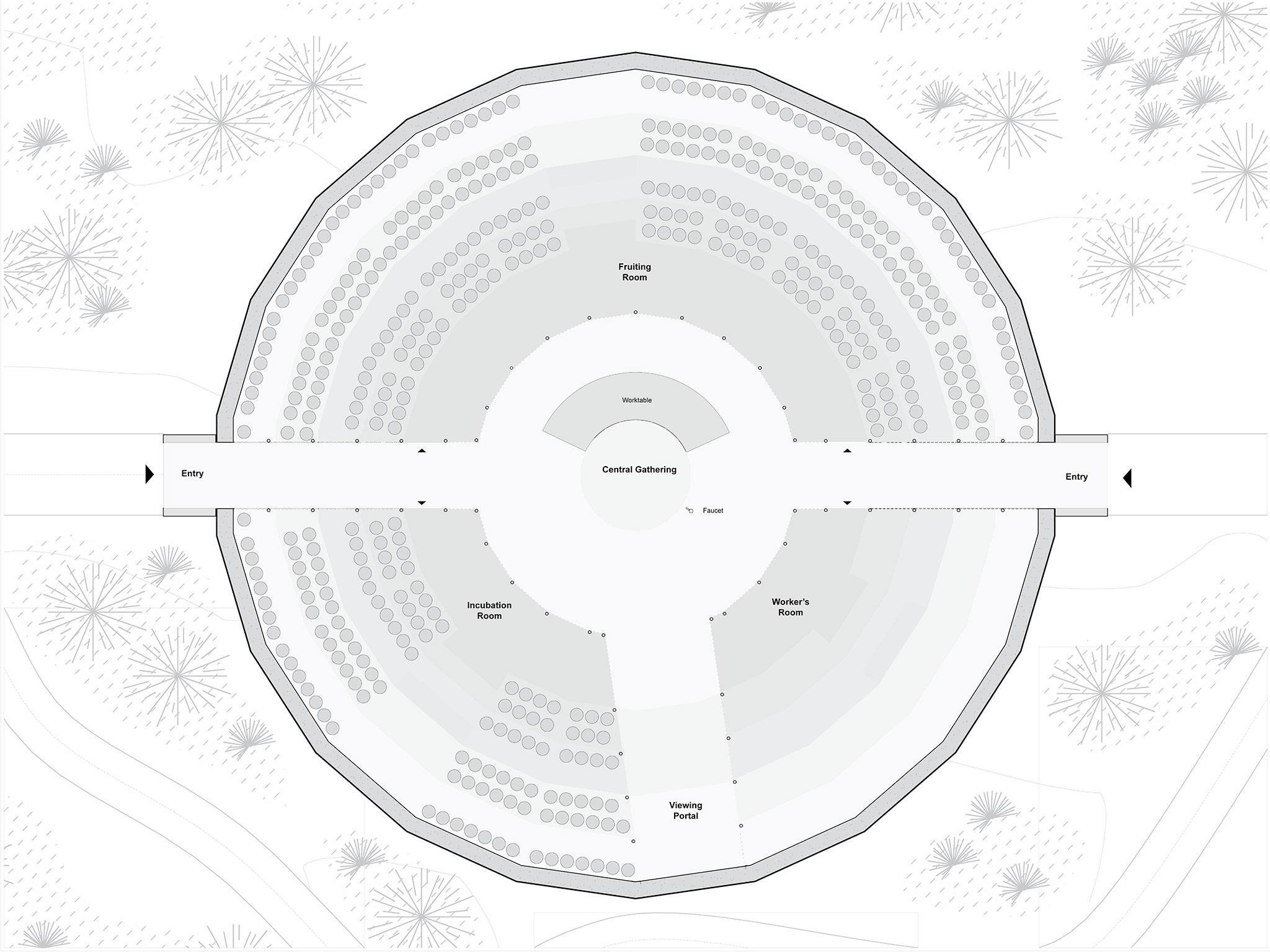 Conveying its simple yet important function, the pavilion is a basic, ellipsoidal form created to optimize interior organization for growing mushrooms. Within, the domed interior can be divided into three chambers – fruiting room, incubation room, and storage – encircling a gathering space at the heart of the pavilion. The lower half of the bowl is stepped, like an amphitheater in the round, to make shelves for handmade terra cotta mushroom pots crafted by local artisans. The stepping and elliptical form create a panopticon viewing experience, rendering the mushroom growing process visible in its entirety.