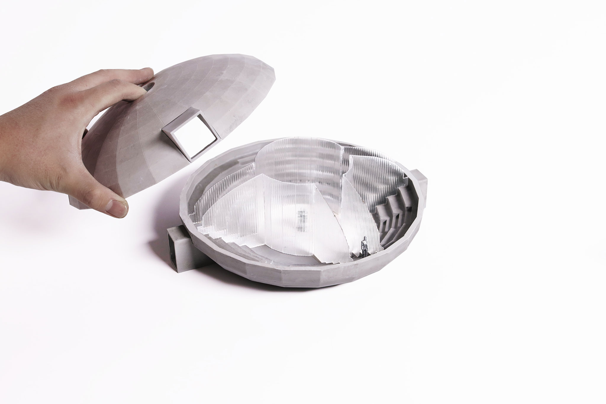 The base of the volume curves inward to minimize the pavilion's contact with the ground, preserve the natural landscape as much as possible, and allow the native guayacán tree to thrive. In the central space, an oculus opens to the sky, and additional openings are created around the lower perimeter to allow natural light to enter. Finally, at the top of the steps, a platform and a portal offer views of the ocean.