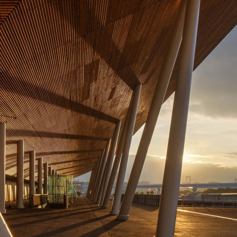 This is a positive realization of "wooded facilities" and "sustainability" announced in the Tokyo 2020 Olympic and Paralympic candidature file. The material was also selected to express the memory of this district which was once a timber storage pond. Based on the architectural concept of “a wooden vessel floating in the bay area," timber is used wherever possible, specifically in the roof frame structure, facade, spectator seats, exterior walls, etc. while carefully considering the characteristics of wood in each application.