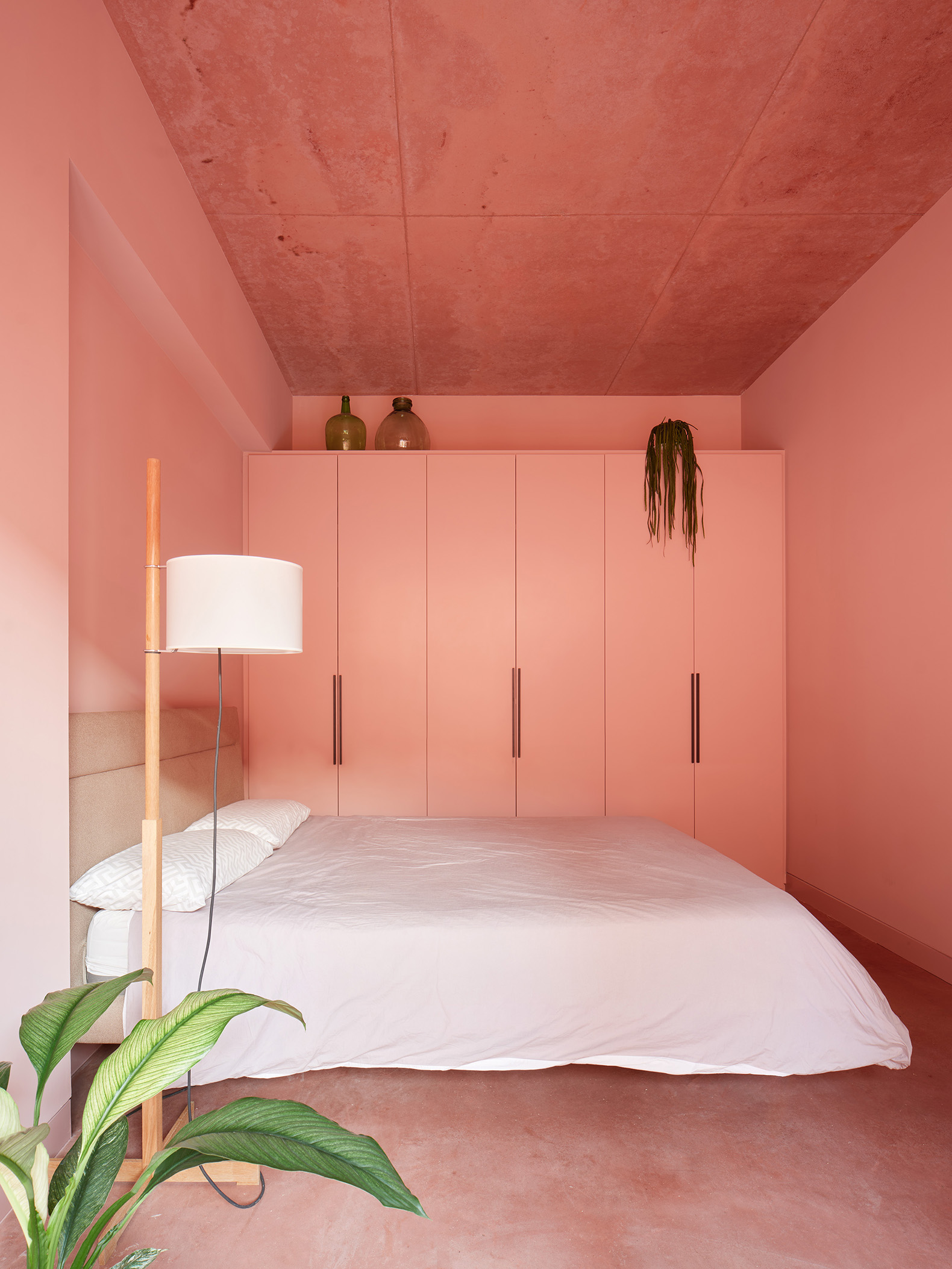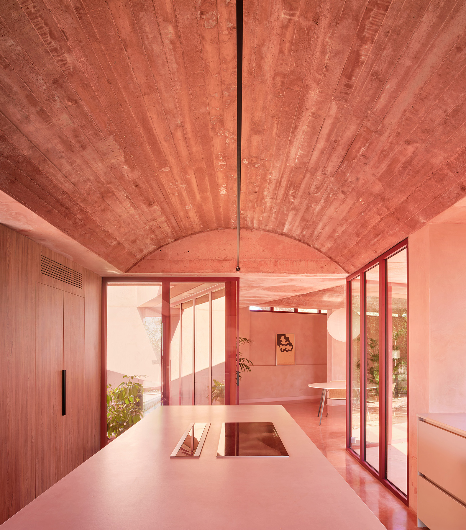 The interior is guided by a single principle: the structure itself serves as the final finish. Accordingly, the architects chose pigmented concrete in a reddish tone, giving the house its identity without additional cladding. Its surface retains the texture of the wooden formwork, a visible trace that adds a sense of handcrafted warmth and reveals the construction process. The vaulted form of the structure – the volta catalana – defines the main rooms, lending continuity, texture and an almost sculptural atmosphere throughout.