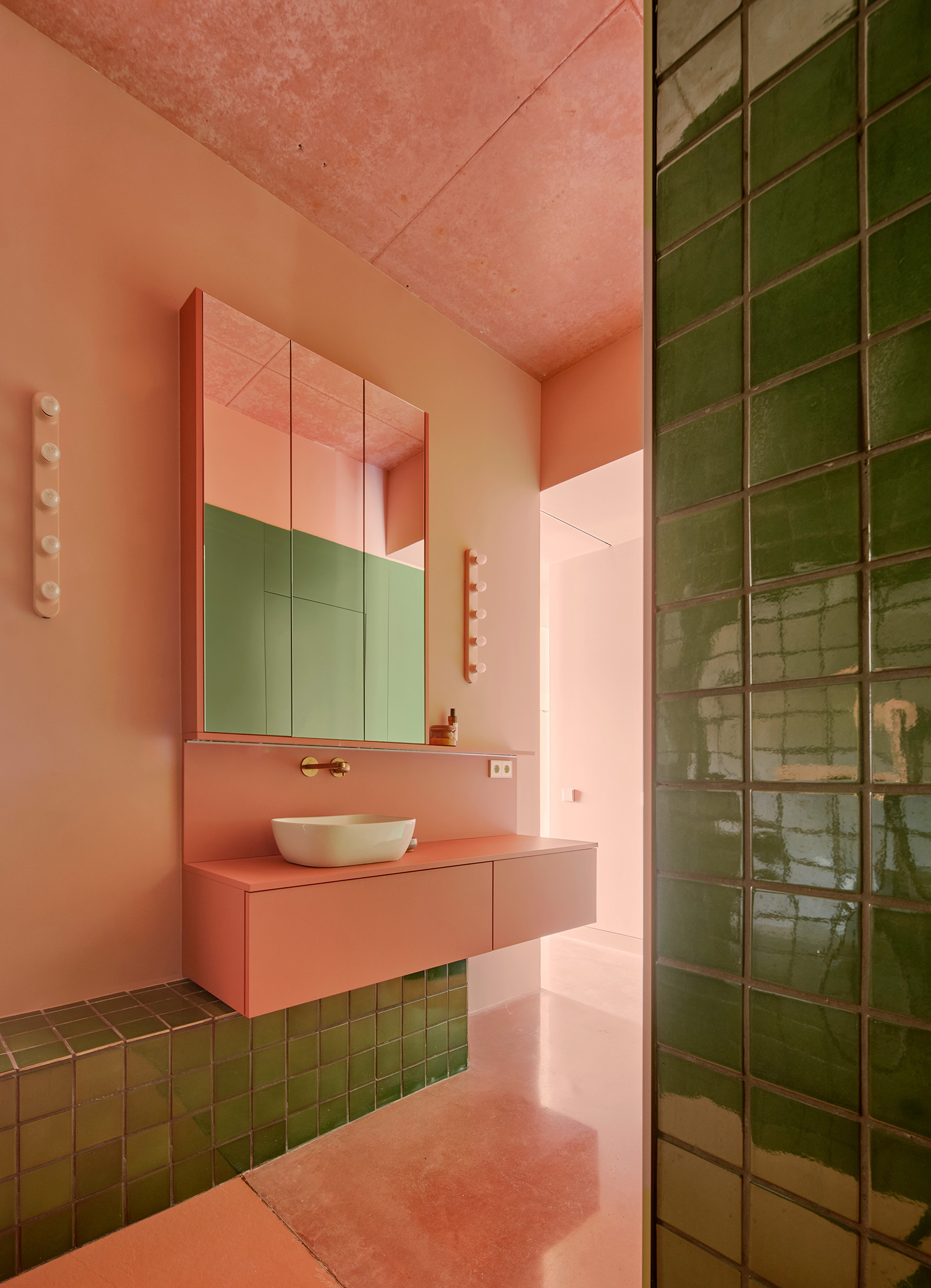 This earthy, reddish material is complemented by the green of the surrounding landscape, which flows in through the large windows, creating a striking contrast with the interior tones. This interplay of colour, light and material continues into the master bedroom bathroom, where green ceramics set against red finishes echo the contrast between the cork oaks outside and the house itself.