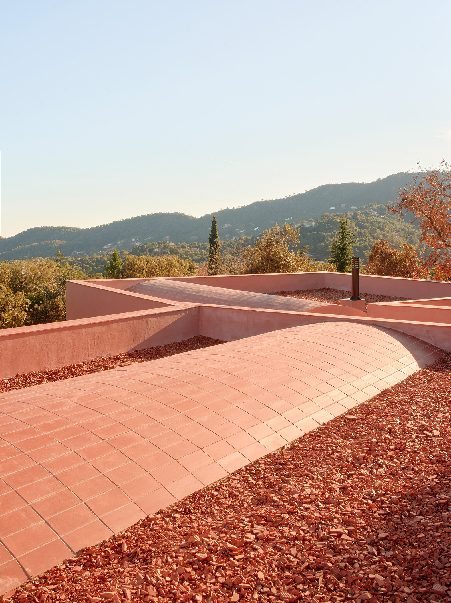 Twobo translated this personal story into a design that blends with the profile of La Mola through careful topographical adaptation and a close dialogue with the surrounding landscape. Two key strategies define the project: the fragmentation of volumes and the use of materials that harmonise with the terrain’s reddish palette. The result is a house that serves both as a family retreat and an extension of the landscape, with clear references to Alvar Aalto’s famous Muuratsalo Experimental House.