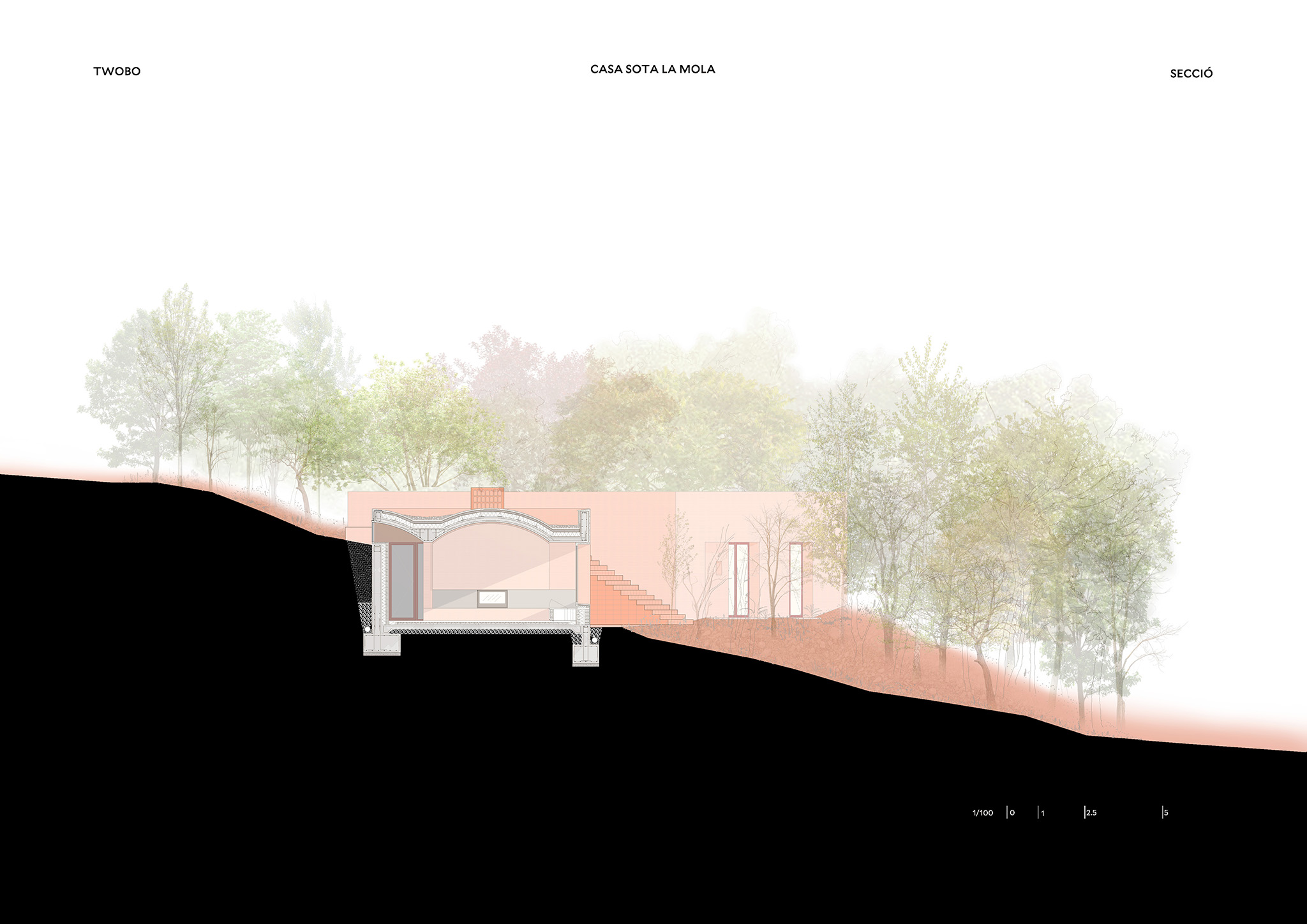 Twobo has created architecture that rises organically from the land, reinforcing its connection with the site’s pronounced and ever-changing topography. Nestled between damp run-offs and pockets of light, Casa Sota la Mola balances the shade of oaks and holm oaks with the warmth of the afternoon sun, combining family living with the profound serenity of nature.