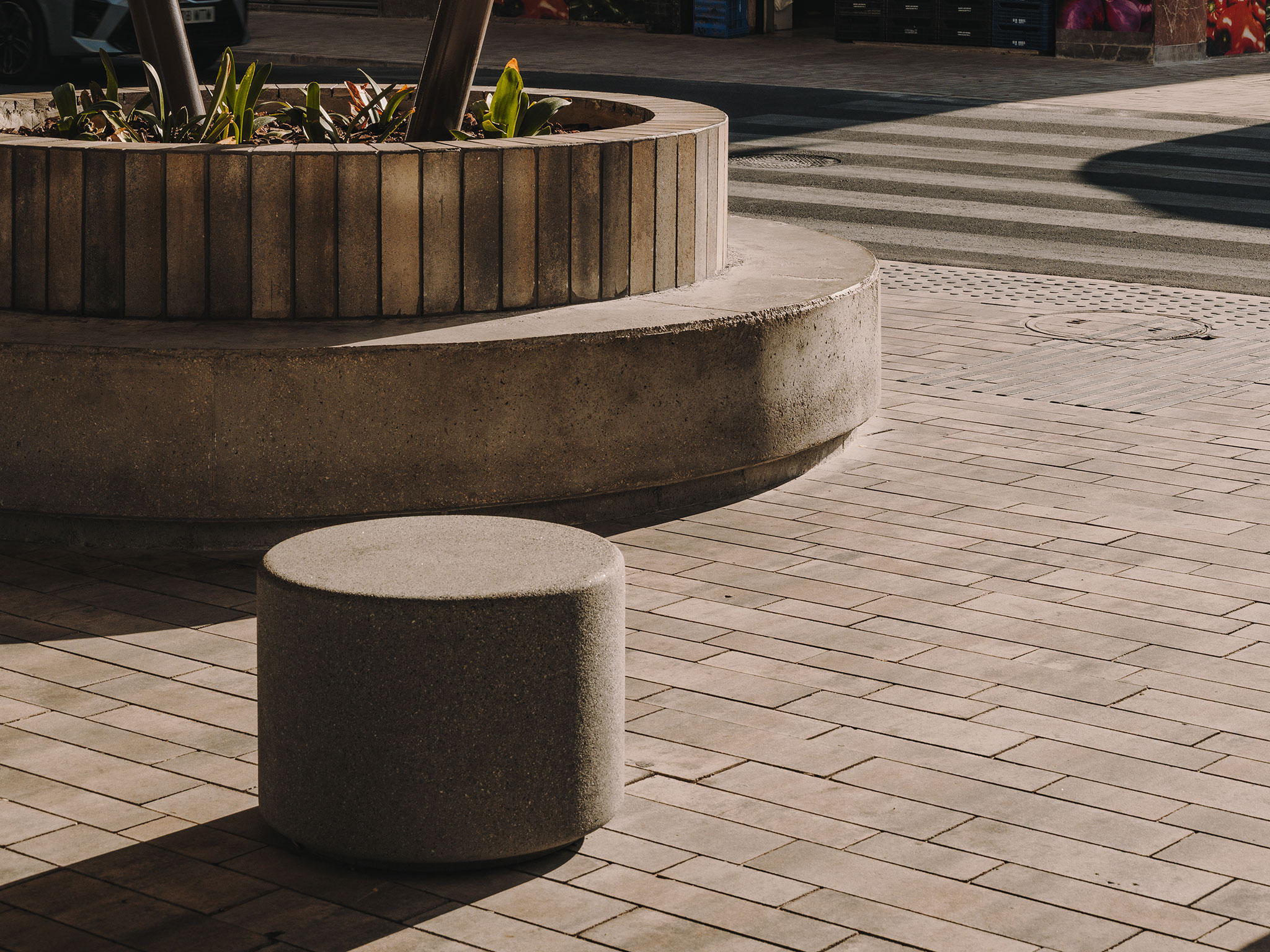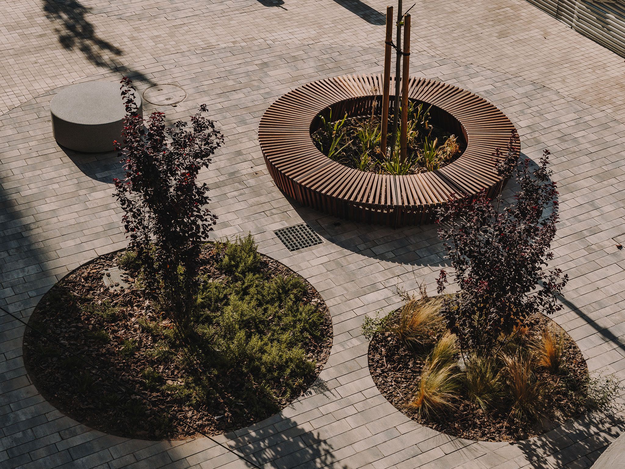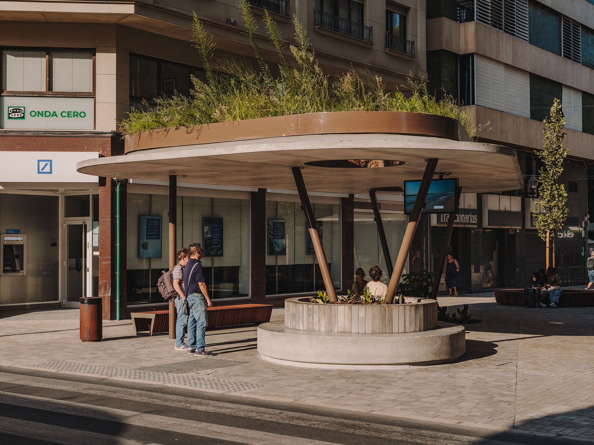 Three low-maintenance concrete pergolas with extensive green roofs are integrated into this new pedestrian street designed for simply being. The benches are designed to allow people to enjoy the urban space in different ways. The circular planter-benches allow people to take advantage of the pergola's shade while waiting for the bus at any time of day. Linear benches define boundaries that separate seating areas from walkways, while small cylindrical benches introduce a more playful character and encourage social interaction.