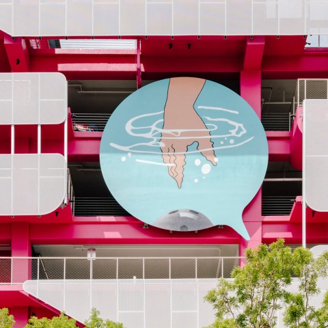 In the space between Nicolas Buffe’sfacade and that of K/R, Spanish firm Clavel Arquitectos’s Urban Jam draws from the rebirth of urban life in the Miami Design District - where old structures and discarded spaces have been revived by architectural and urban designs. Urban Jam suggestsa similar “repurposing” of very familiar elements, using 45 gravity-defying car bodies rendered in metallic giold and silver. In effect, the styles of years past gain a second life as lux sculptural objects, caught in a surreal vertical traffic jam.