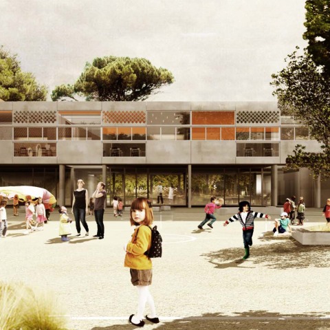 The construction of the new children's school for the Lycée Français of Madrid is a 5000 m² building with 21 classrooms for children between 3 and 6 years old. The main objective of the Lycée Français of Madrid and the French Education Agency abroad to achieve the French environmental certificate HQE. From the beginning the project approach is austere and sustainable.
