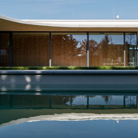 The design of the interior further develops the spatial concept of the house. It is dominated by a mutual relationship of seamless roof, grey floor and long walls cladded in oak. These basic elements define the space which could be randomly occuiped by people objects and furnishing.