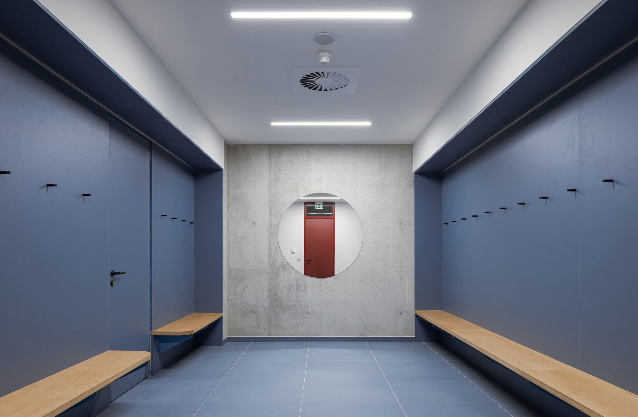 The school is designed to meet the energy performance class A. Heating is provided by heat pumps, and all spaces are equipped with controlled mechanical ventilation, while each occupied space can also be naturally ventilated through operable windows. The overall energy balance is enhanced by photovoltaic panels on the roofs of both the main school and the sports building, as well as by external shading, and high-quality thermal insulation.