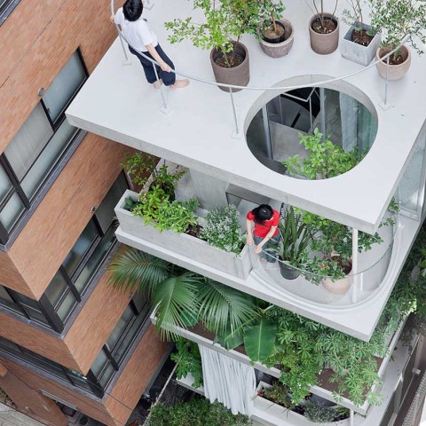 To take advantage of the reduced space on the site, the building grows in height, creating changing terraces and holes that allow the use of natural light on all floors. The structure of vertical concrete slabs allows to leave the plants free, without walls, and the opportunity to incorporate small gardens for each room.