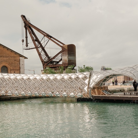 Evoking the historic network of bridges that characterizes Venice, the Gateway actively connects new electric modes of transport, which function as carbon-neutral mobility solutions during the opening week of Biennale Architettura 2025. In line with contemporary sustainability principles, it will be the first fully circular and zero-waste Venice Biennale.