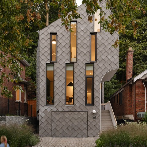 On a sloping site in Toronto’s east end, this single-family, four-bedroom home is tucked into a gully with steep slopes up the backyard and on the opposite side of the street. Canadian studio Reigo & Bauer designed this ground-up build using geometric manoeuvres to make the most of the narrow site and create an eye-catching structure.
