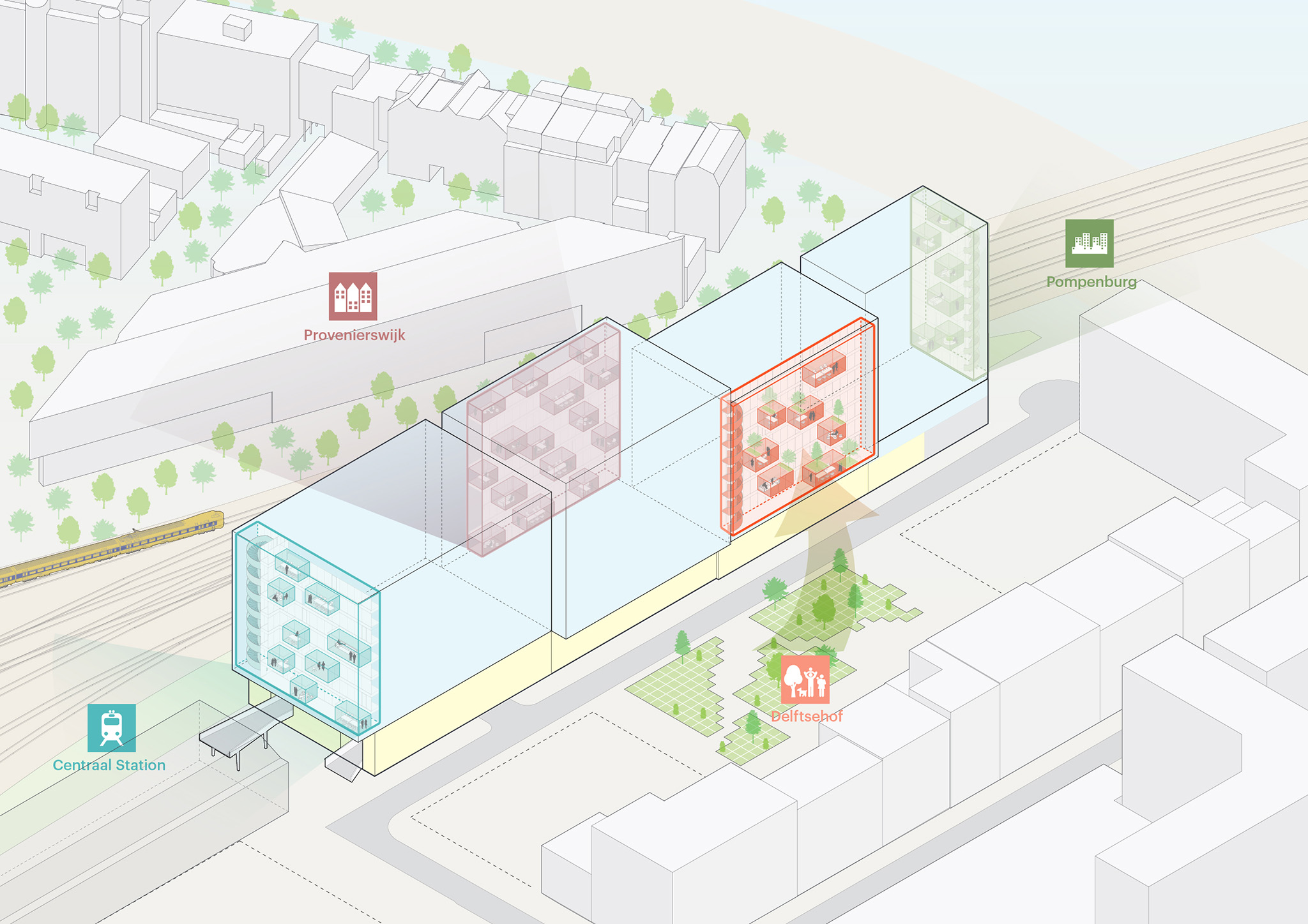 Compositionally, the proposal evokes the surrounding reconstruction blocks, but stacked vertically, advocating for a "second reconstruction." The building is divided horizontally into four sections, each with a clearly defined base and one or two blocks above. With a total of 11 new "Schieblocks," the proposal drives a new phase of densification in Rotterdam.