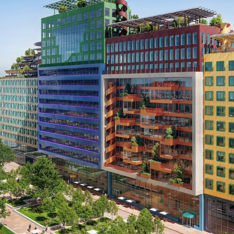 On a narrow strip of land adjacent to the railway line, the nearly 150-meter-long and 61-meter-high building presents itself as a high-rise office district. Through the use of vibrant colors, the different blocks that make up the project are clearly distinguished. The materials and color palette employed were carefully studied to reflect the distinctive spirit of Rotterdam.