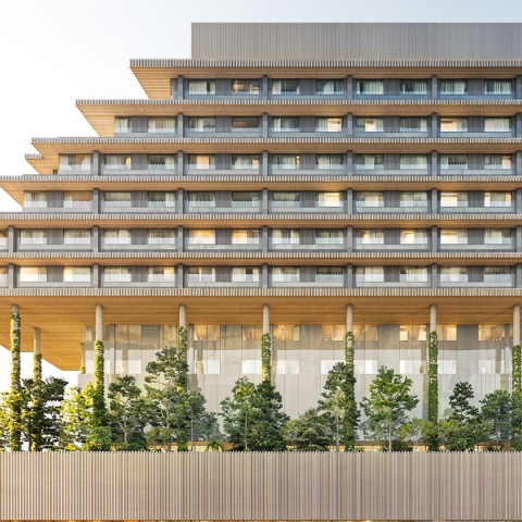 The new hospital will be largely clad in terracotta and glass curtain walls on the upper levels, while the access area's ceiling has a wood finish. The landscaping strategy includes an external garden on the sixth level of the new hospital.