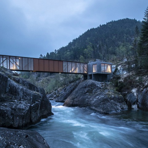 The idea behind the chosen proposal was to establish a horizontal reference line in the landscape, to emphasize the undulant and organic shapes in the bedrock. The bridge consists of two steel lattice beams in corten steel on each side of the walkway, with a system of vertical and diagonal members. The walls are clad with sheets of stainless steel stretch-metal and corten steel. On the south side of the river, after crossing the bridge from Sand, a small pavilion in concrete was made to accommodate small picnics and pit-stops for passers-by.