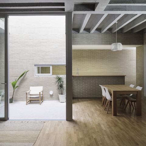 The intention of incorporating the patio space into the living room suggests using the same material for the walls of one and the other to blur the limits between the interior and the intermediate spaces. A greyish brick that alternates two formats constitutes the two walled boxes that make up the thick skin of the house. This ceramic materiality together with the concrete floors gives the space a constructive expression that nuances the abstraction of the plant.