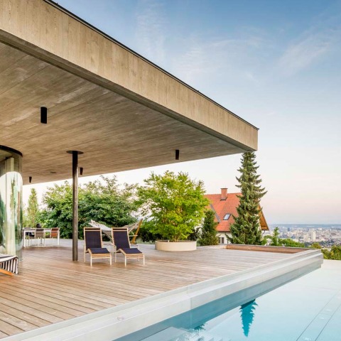 The dark golden brown of the mosaic tiles on both the interior and the facade match the fair-faced concrete surfaces produced from roughly-cut shuttering; the projecting cantilevered roof covers wide-ranging terrace areas, with wooden flooring that continues from the spacious halls in the living areas. The inner and outer living areas are only separated by delicate full glazing, large parts of which can be opened.