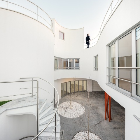 To the street, the house is framed by its entrances and engages it with its cylindrical and central volume. It is also a glimpse of what is beyond, where the massing smoothly adapts between the central garden and the perimeter walls.