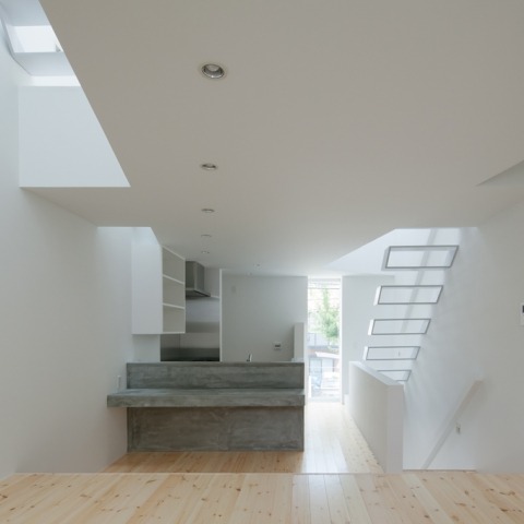 According to the lifestyle of the client, the bedroom of the couple and wet areas were placed in the ground floor, the family room was placed in the first floor, the rooms of children were placed in the second floor and the terrace was placed on the roof. For a structural reason, the large openings were not able to open out on the road side of the first floor of the building. So, I rotated the volume of the second floor 14 degrees for the axis of the building, and interstitial spaces between the rotated wall and the outer wall of the building became voids. The skylight was set up in the upside of the void, and is intended to allow natural light to drop on the family room of the first floor.
