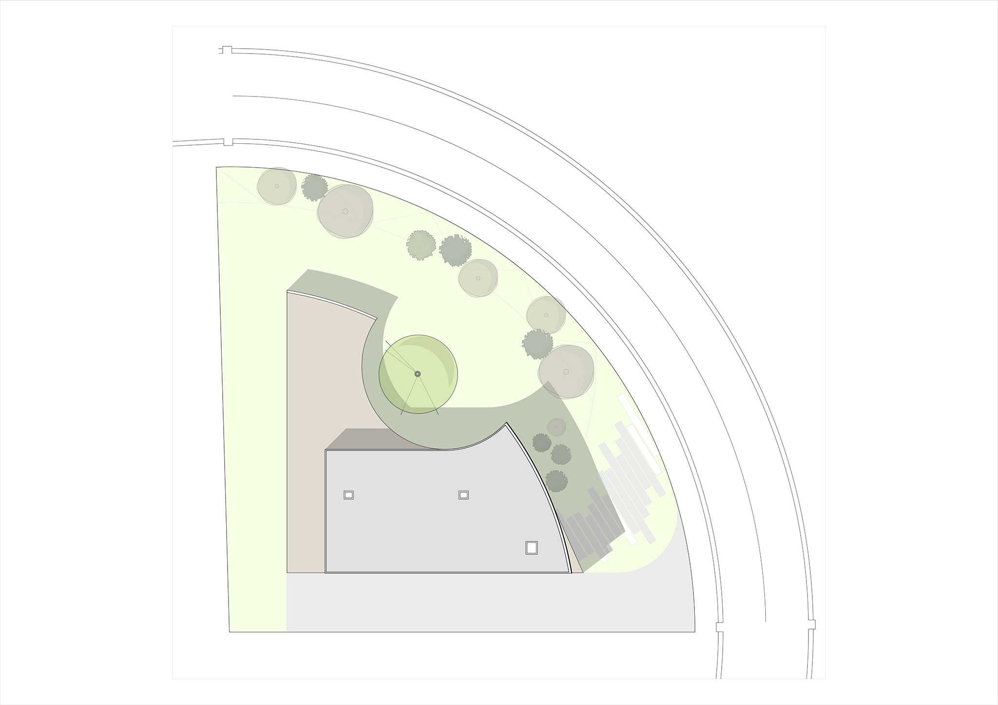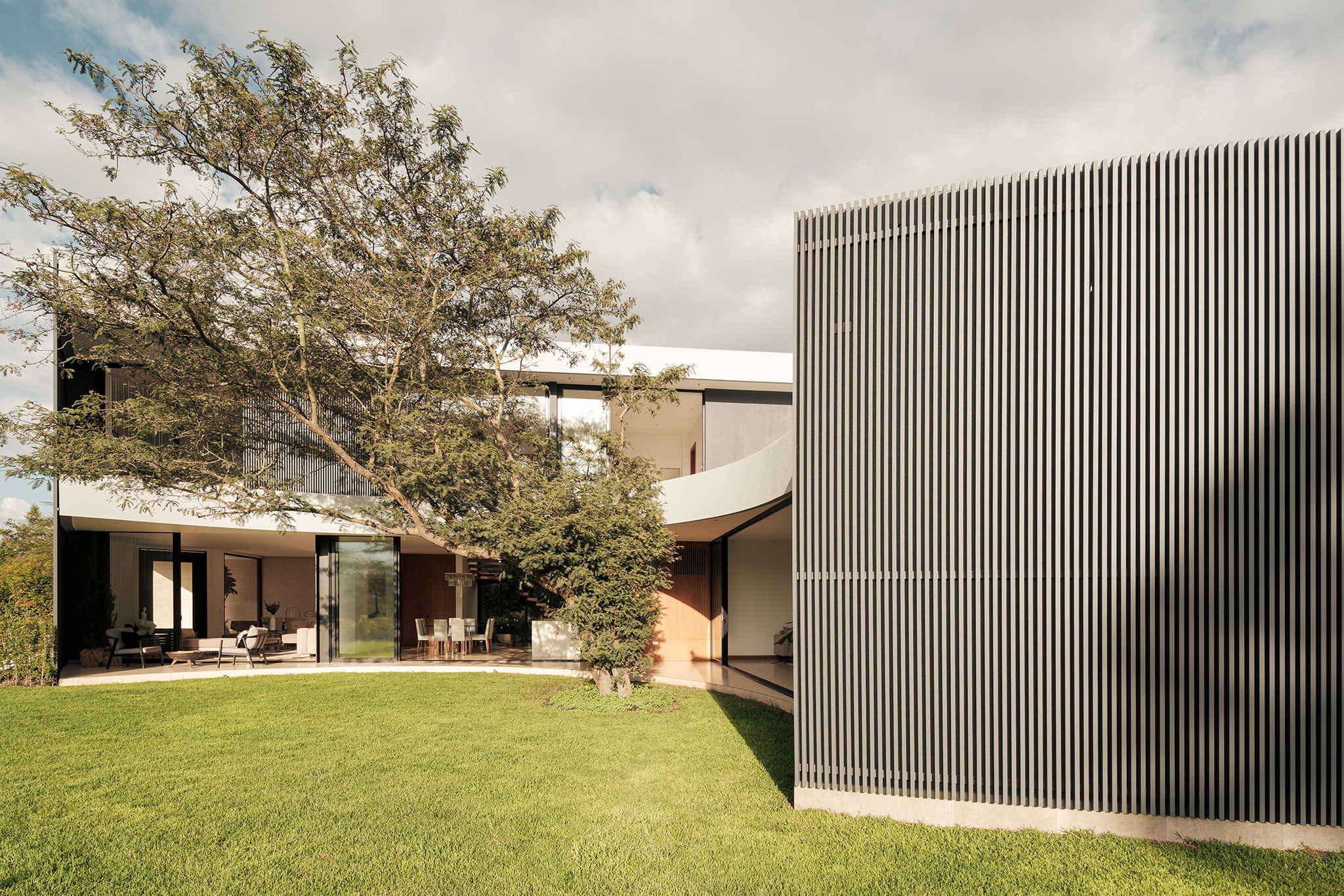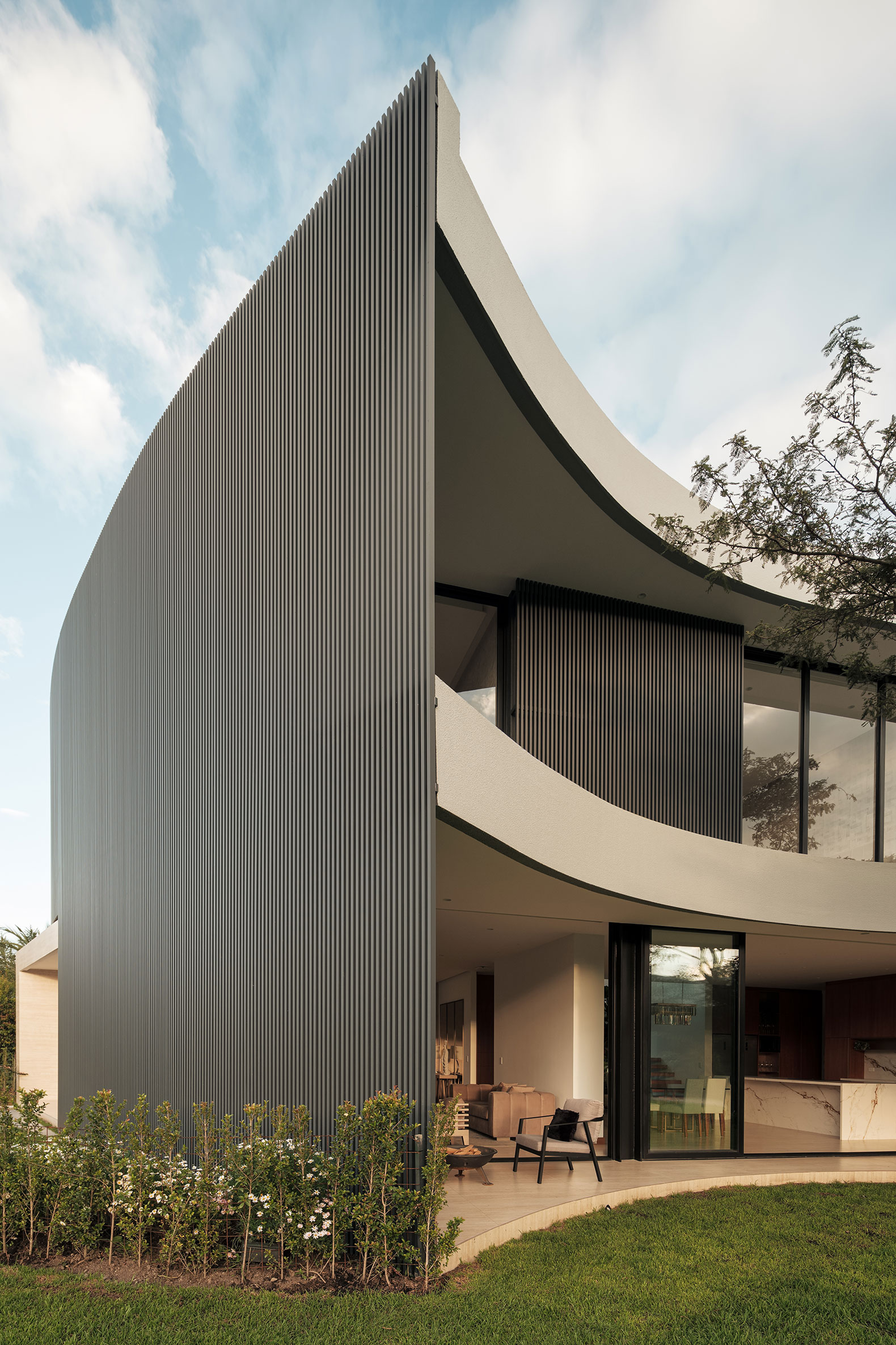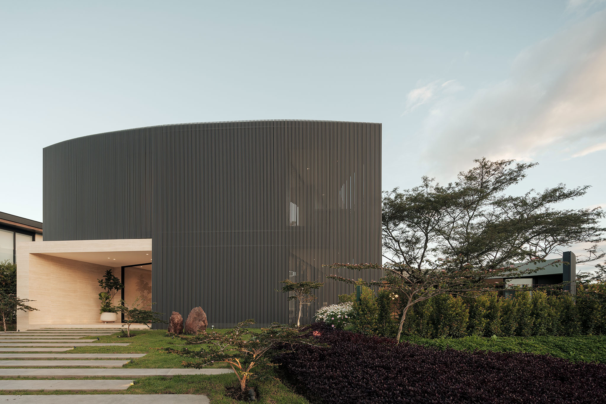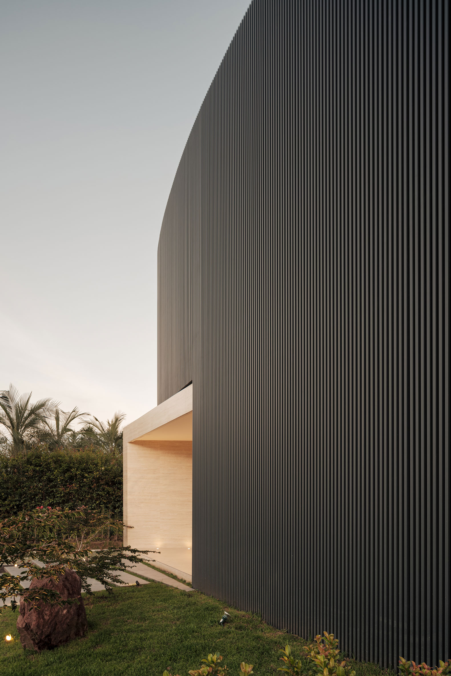 The light and permeable façade enhances the curved shape of the volume through vertical elements that give rhythm and unity to the whole. A large, strategically placed void marks the main entrance and provides a visual pause that reinforces the contemplative character of the house.