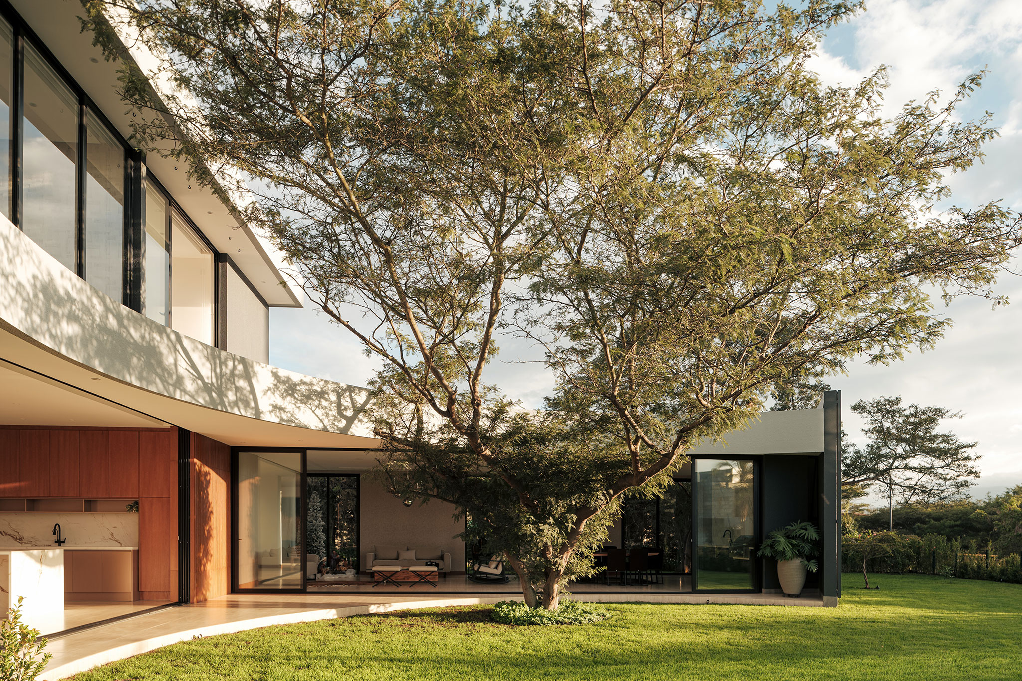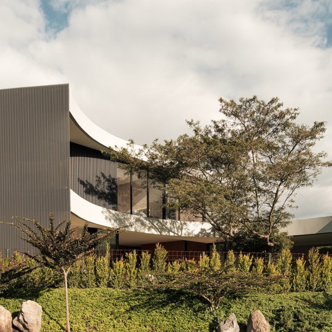 Casa Riba is located in the Puembo Valley, in the Andes mountain range, on a curved corner lot. Its location and orientation were fundamental to its design, highlighting the presence of a carob tree in the center of the site, which became the conceptual axis of the project and the point from which the view of the city of Quito is framed.