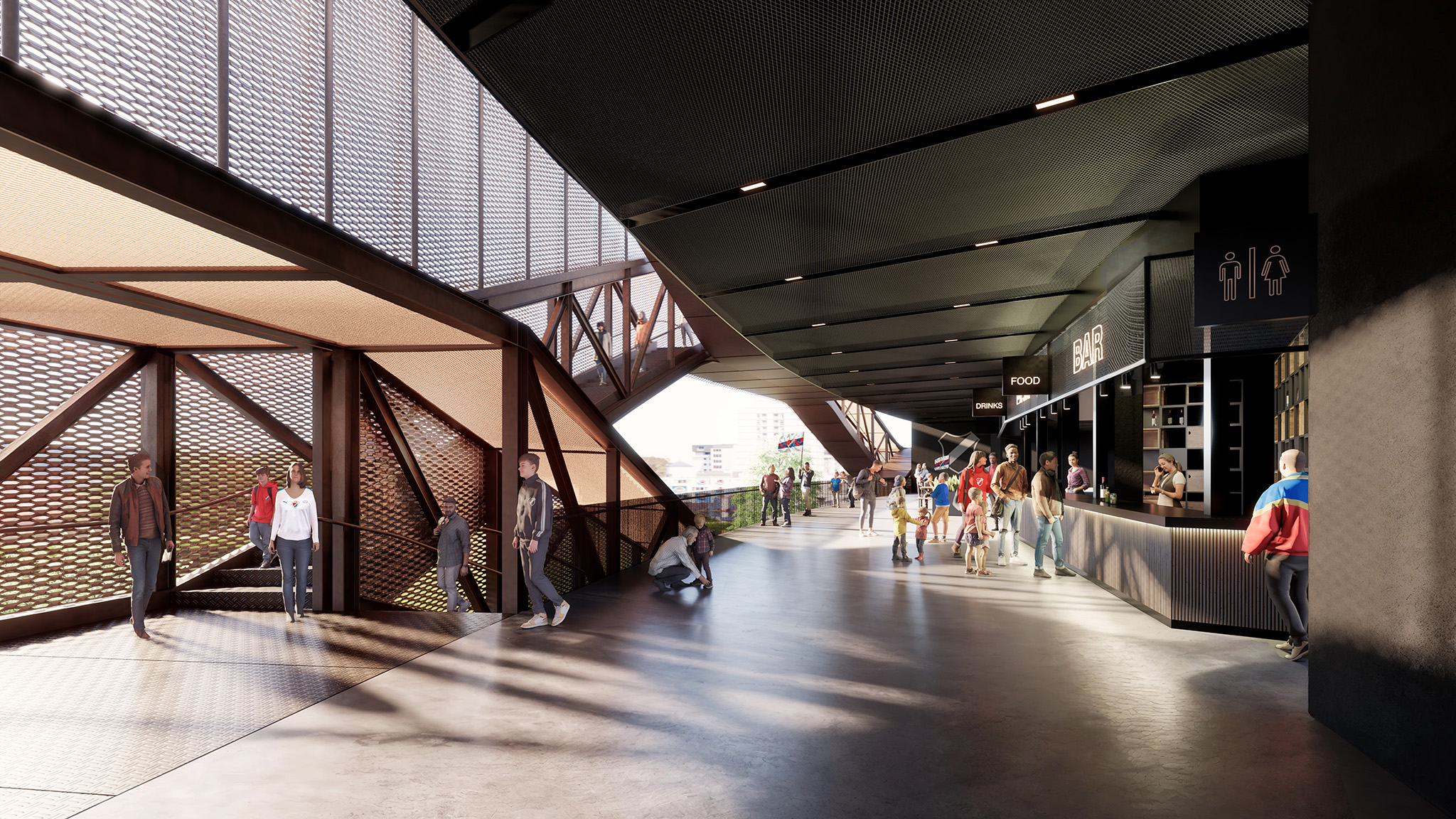 The integration and connection of the stadium with its surroundings is achieved by creating a hexagonal grid that structures the base and the façade through multiple circulation routes, linking the stadium across different levels. This hexagonal pattern takes shape by bringing ramps, staircases and landings to the exterior skin. Wrapped in a steel structure, the aim is to express the functional elements as a compositional feature, referencing the honesty of the region’s industrial architecture, where exposed walkways and steel structures form a characteristic landscape.
