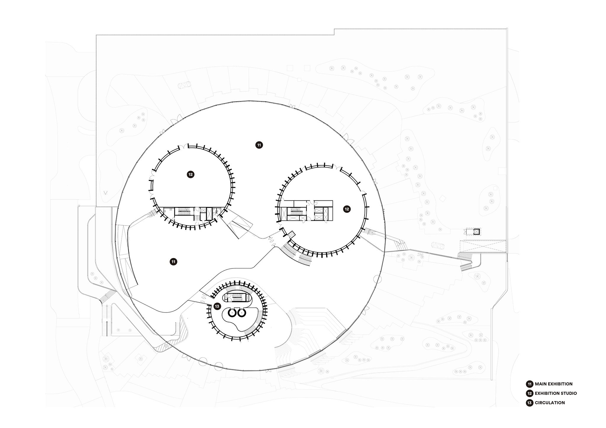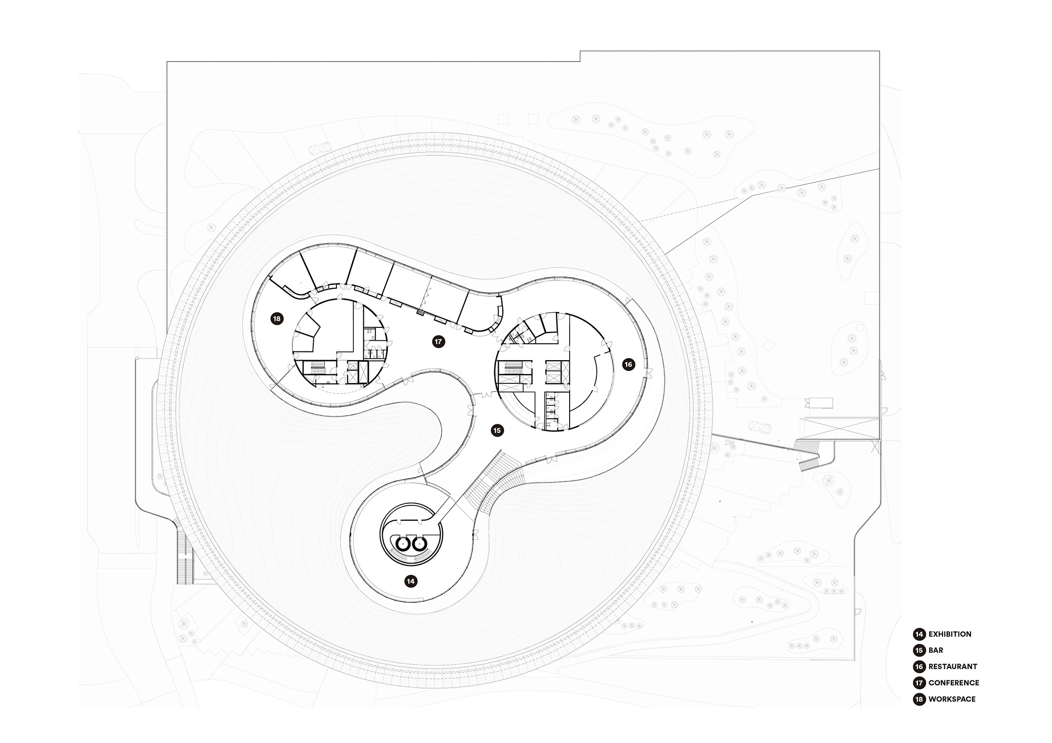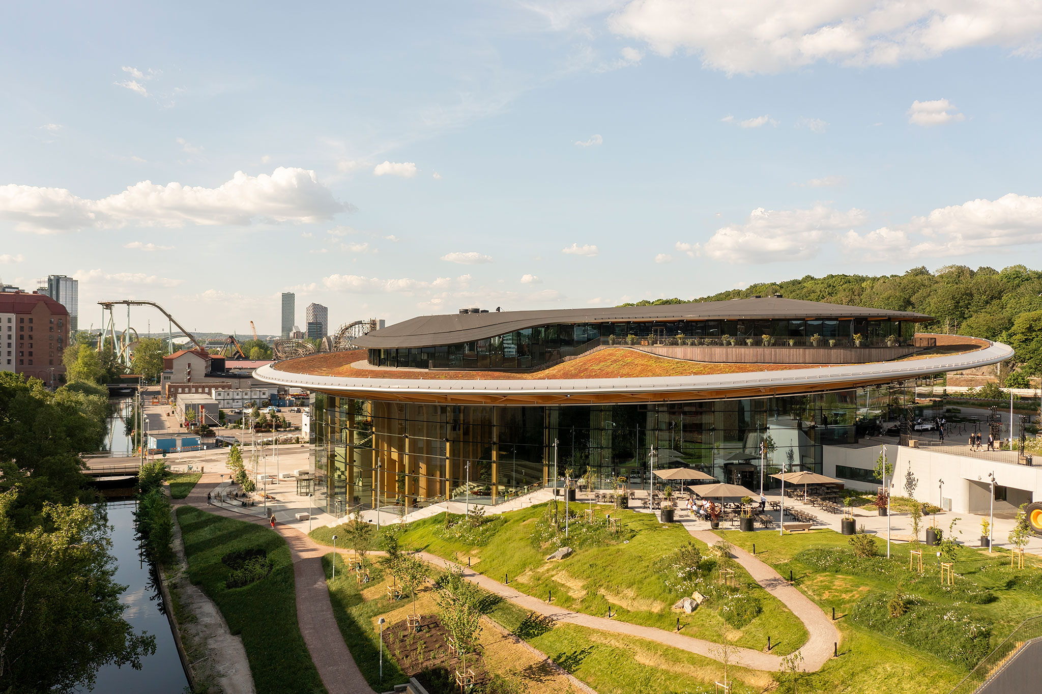 The expansive round structure encourages visitors to create their own journeys both indoors and outdoors, regardless of whether they hold tickets to the exhibition inside. Surrounded by a thriving landscape that extends onto an accessible roof, the building embraces the regional landscape, in form, materiality, and culture, bringing a native piece of Swedish nature to the middle of Gothenburg.