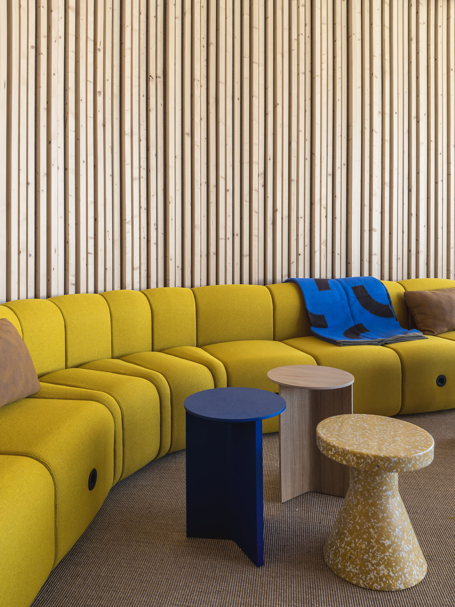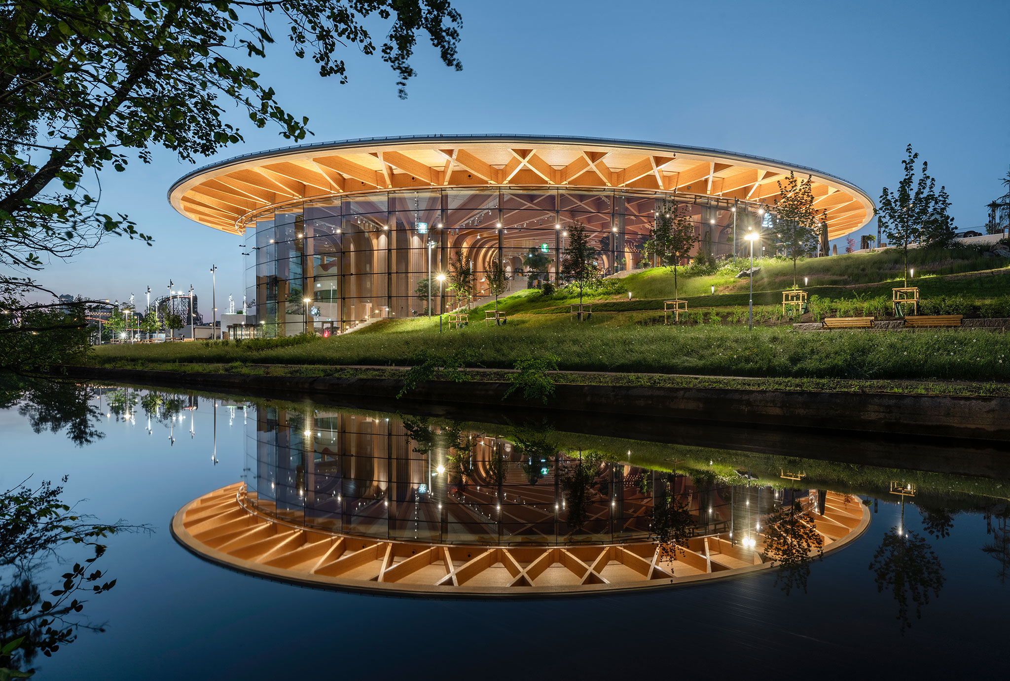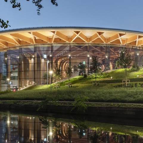 Spanning 22,000 m², the main timber structure, made of glulam and crosslaminated timber, forms three striking tree-trunk like columns, fanning out to carry the entire load of the roof - enveloping visitors in a welcoming forest-like canopy.
