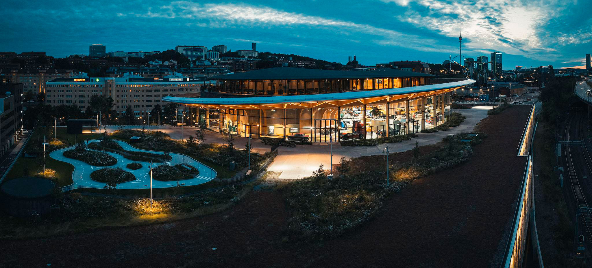 “World of Volvo,” designed by Henning Larsen, unfolds within a large circular structure surrounded by lush landscaping that extends to an accessible rooftop terrace. Its spaces are designed to host cultural events, talks, and conferences, with a capacity for up to 1,100 people. The 4,500 m² exhibition area presents the public with a comprehensive overview of Volvo’s history and philosophy, featuring iconic vehicles, immersive stories, and interactive displays.