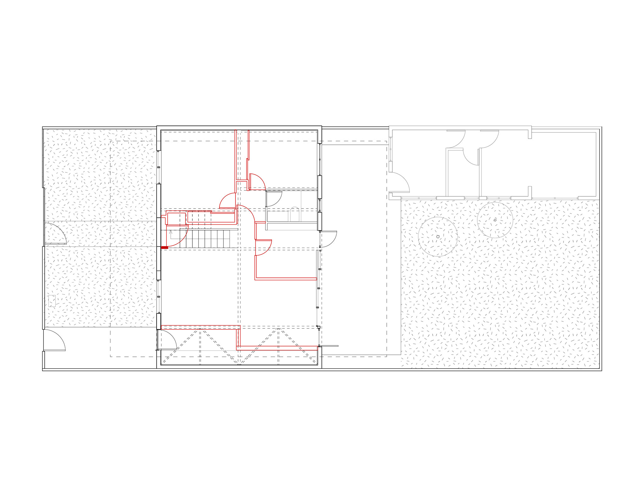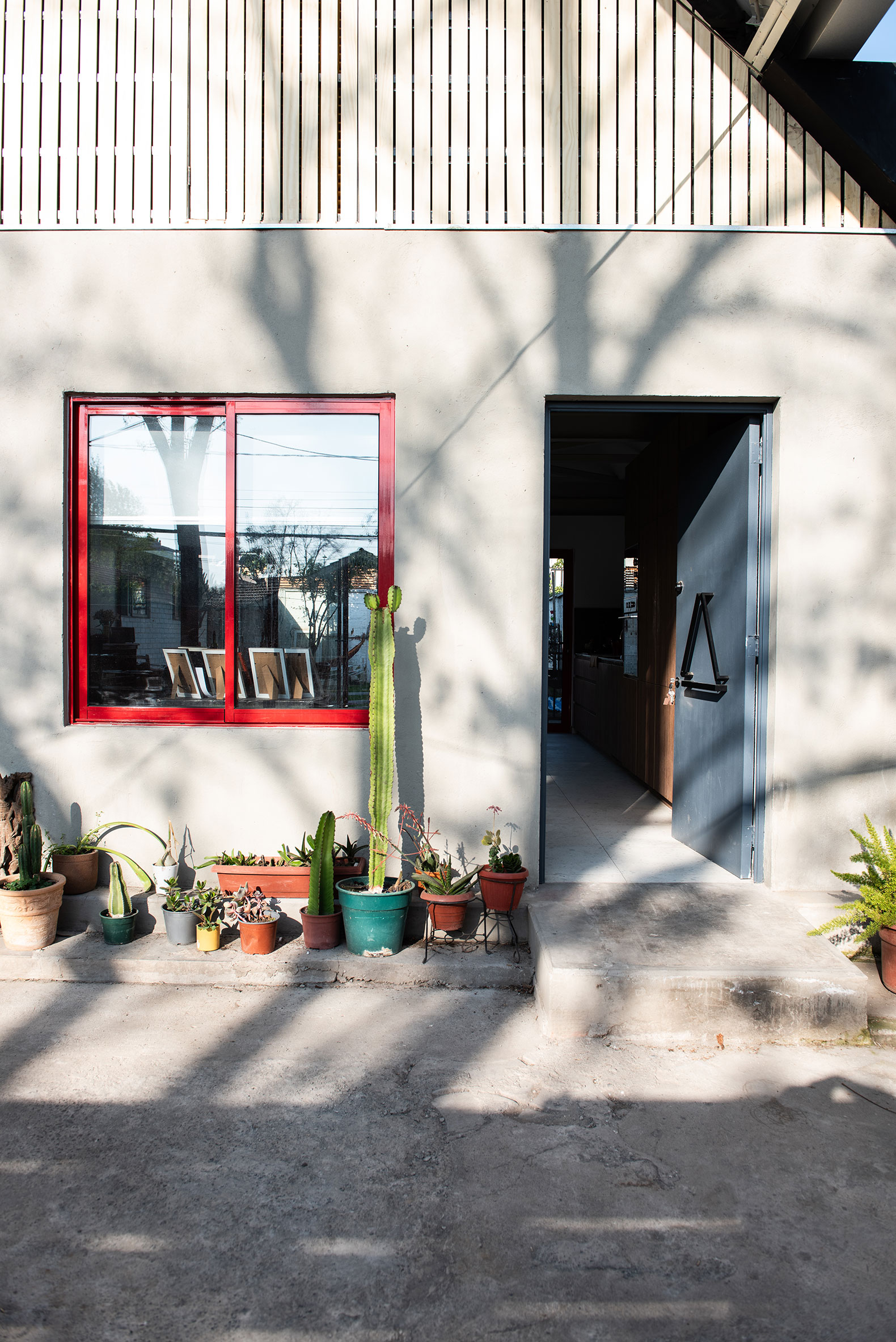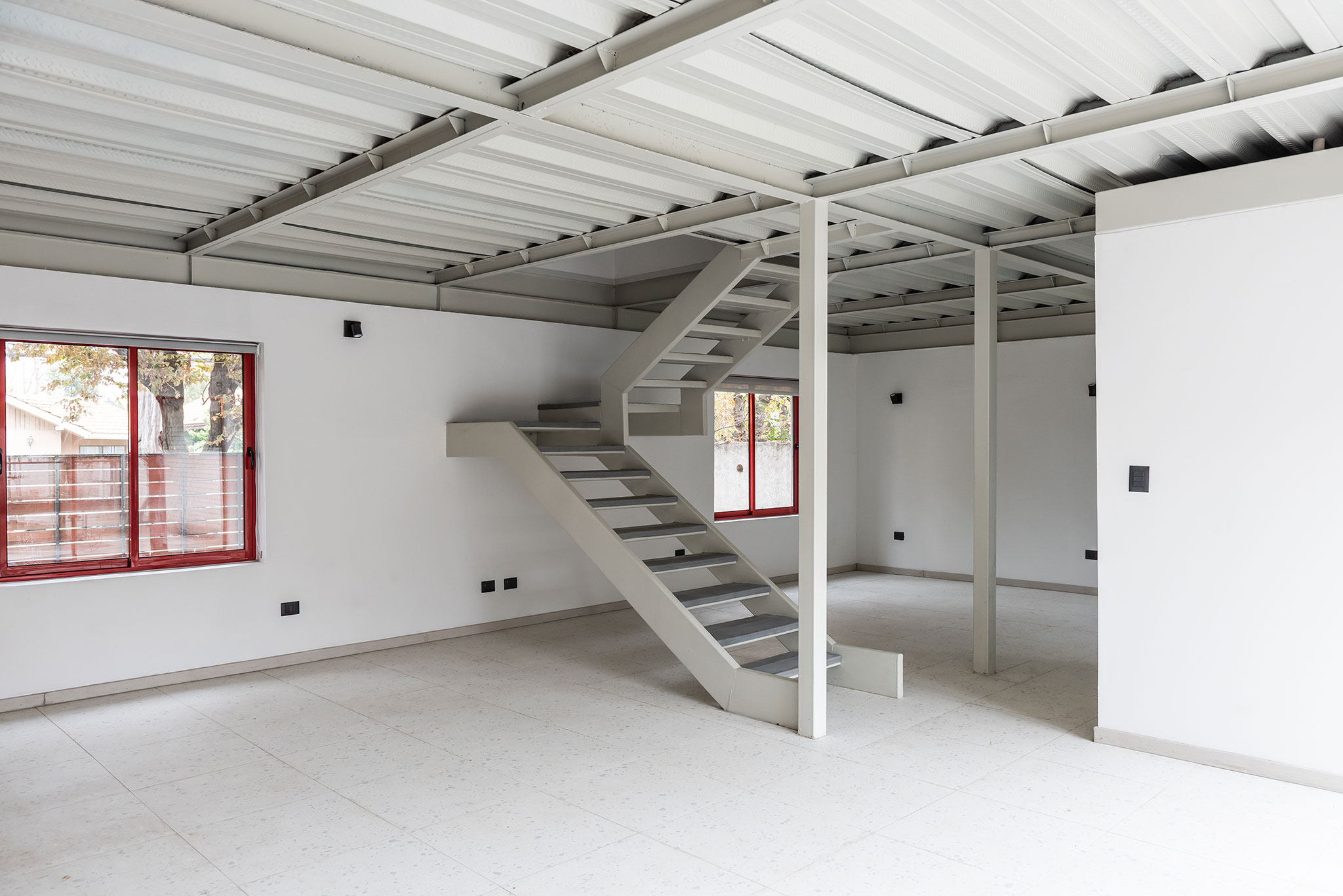 From the outset, the economic dimension of the project became the primary design variable. To address the scarcity of resources and transform this constraint into a design opportunity, the following strategies were used: avoiding unnecessary division of space, working with industrial materials not always used in residential projects, and minimizing finishes. In terms of volume, the second-floor addition is essentially the result of the possibilities allowed by local regulations requiring 60º slopes. This structurally simple morphology meant that a series of technical, legal, and functional requirements converged at the property lines. The other key aspect of the building's volume was the eaves. These extend two meters towards the street and three meters towards the interior courtyard from the facade's plumb line. This design aimed to protect the facades from the sun—primarily the afternoon sun—while simultaneously creating intermediate areas or terraces, covered but open to the exterior—especially towards the interior courtyard.