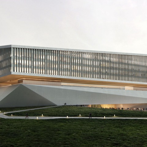 The 309,000m² Zoomlion Headquarters will house offices, the Zoomlion Museum, a data centre, a canteen, training and research areas, and sports facilities. HENN’s geometric design balances the client’s production needs with a sensitivity to its rural context; the Headquarters blends into the hilly and densely wooded Changsha green corridor. Made from white concrete, the classic architectural plinth becomes a faceted landscape of walkable green slopes and staircases. This new ground plane traverses an irregularly sloped site and spans a busy motorway to create seamless connections between the north and south sides of the site. The angular main building is wrapped in transparent floor-to-ceiling glass and cantilevers twelve meters over the site, appearing to float above the folded stone landscape.