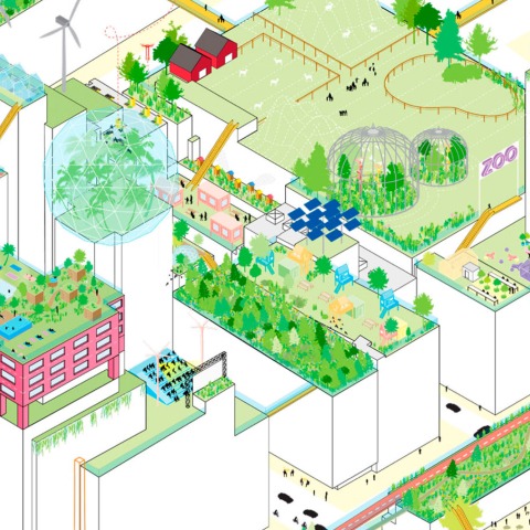 Rotterdammers are increasingly becoming used to seeing green roofs and even rooftop forests, thanks to the completion of MVRDV’s Depot Boijmans Van Beuningen. Yet flat roofs can be used for much more, for example storing water or as an event space. The Rooftop Catalogue offers an inspiring overview of no less than 130 different possibilities, from personal offices to sports fields to a cemetery.