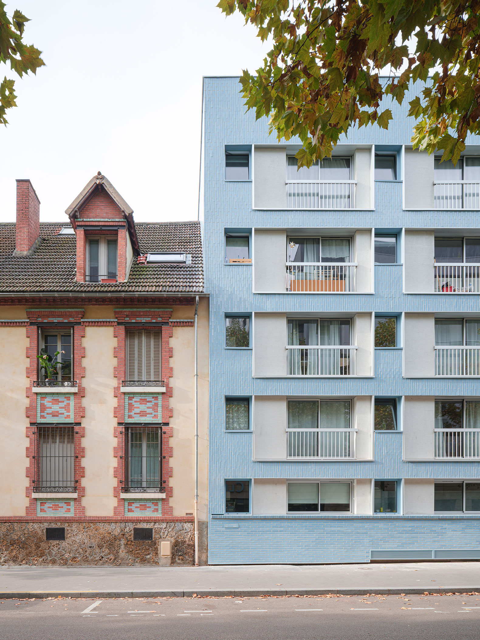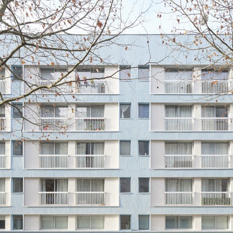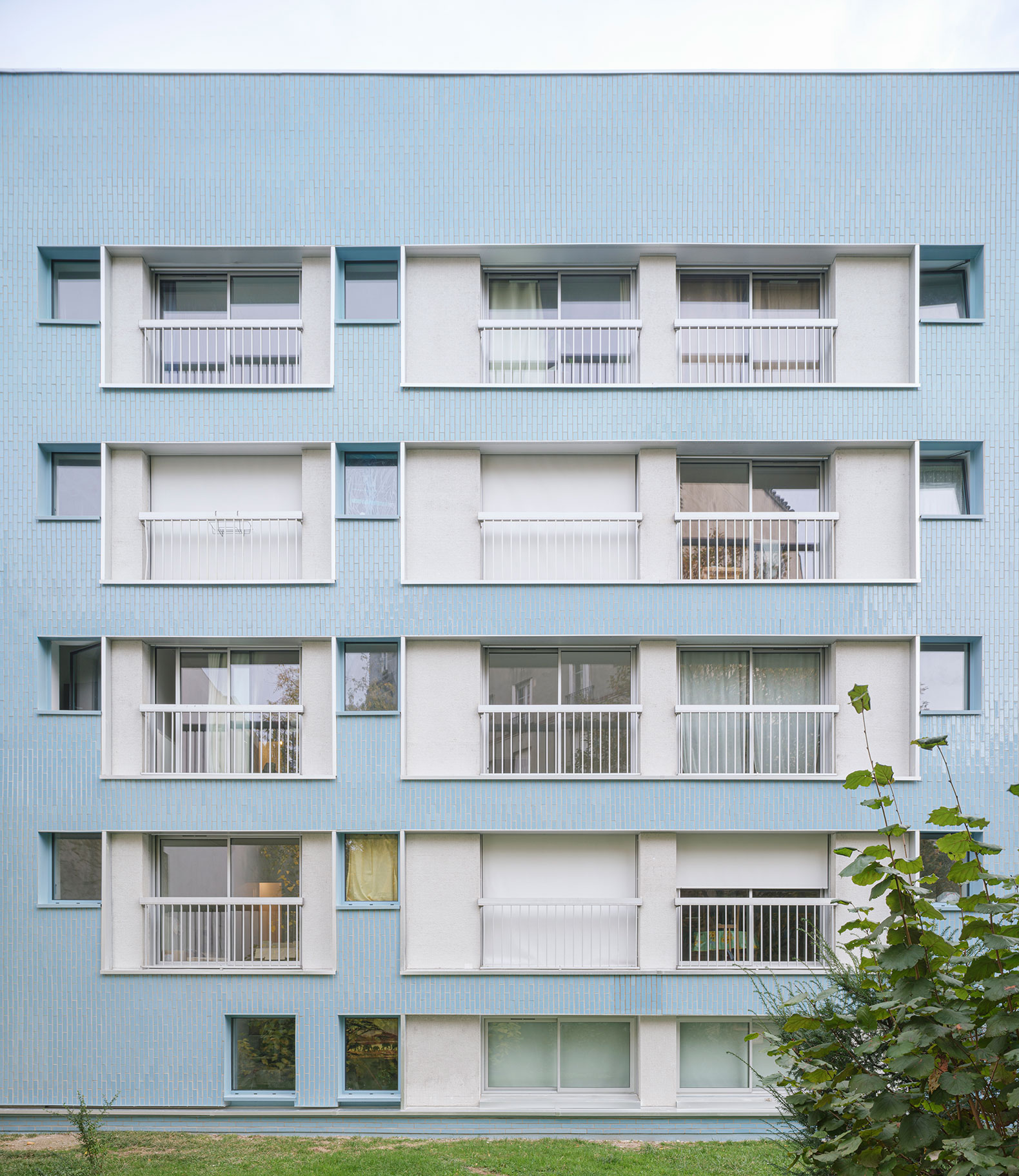 The new insulating layer, composed of insulating panels covered with blue-glazed tiles, echoes the materials that characterize the neighborhood, where brick, stone, and glass block facades stand side by side. The vertical arrangement of the bricks reflects the earthenware tiles of the nearby Cité du Refuge, while the blue tint echoes the moldings of the adjoining house. The partial thickening of the complex creates an inversion and amplification of the façade's relief, with elements that were once protruding and which are now set back, framed by the new textured façade. The result is an envelope that changes appearance with the tones of the sky and creates a residential building that now stands out in both its immediate and distant surrounding environment.