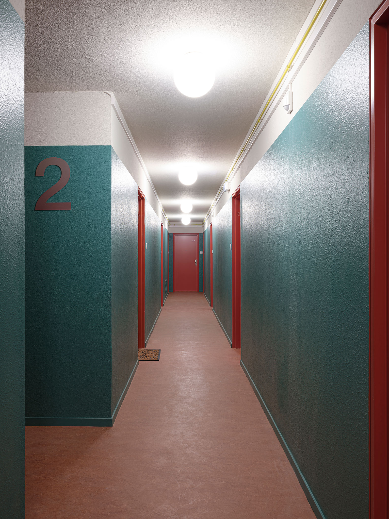 Nested in a rationally organised parallelepiped, the 49 apartments (one- and two-bedroom units) are arranged on either side of a central horizontal corridor, creating a façade punctuated by openings whose proportions are defined by their function: small windows for kitchens and large bay windows for living rooms. Despite two street frontages, this typological repetition gives the façades a single language that makes the residence easily recognisable in its near neighbourhood, on both sides of the roads.