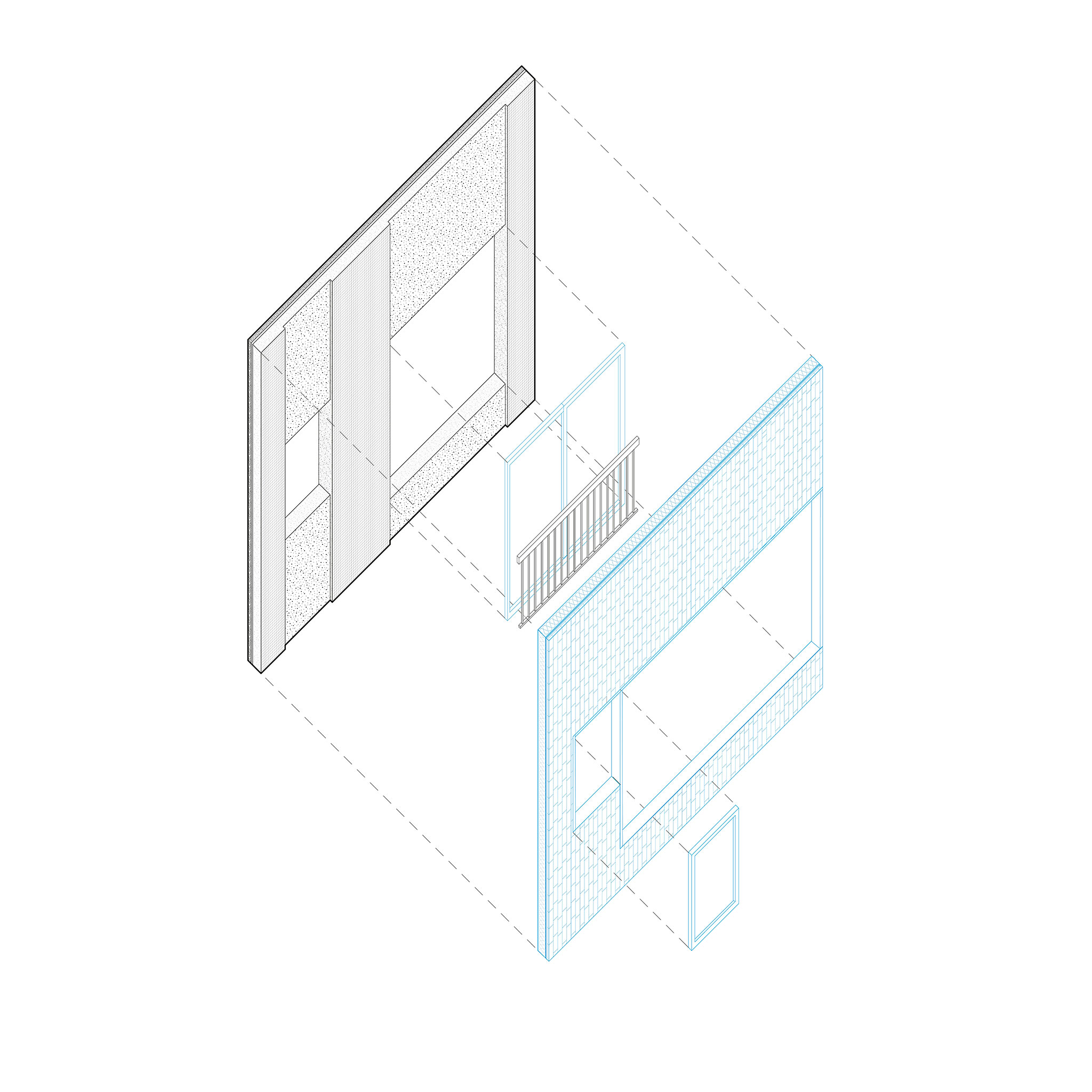 Based on the performance and condition of the existing structure, the proposed exterior insulation is conceived as a transitional surface between two construction periods, intervening subtly to preserve the building's identity within the urban landscape. The new insulating layer, composed of panels clad in blue glazed tiles, evokes the materials that characterise the neighbourhood through this new textured façade. The project views insulation not as an element that erases the existing structure, but rather as one that can complement a comprehensive architectural approach.