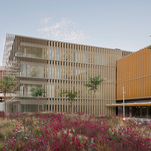 A dual system of vertical aluminium louvers, configured differently depending on façade orientation, protects the interior from direct solar radiation while optimizing lighting and views. Along the building’s perimeter, prefabricated concrete overhangs contribute to solar protection and extend workspaces into the outdoors. The resulting ensemble presents a transparent image, generating a dynamic interplay of velvety colours throughout the day.
