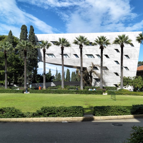 The 3,000 square metre building is defined by the routes and connections within the university; the building emerges from the geometries of intersecting routes as a series of interlocking platforms and spaces for research and discourse. The massing and volume distribution fits very well with the topography, and the nearby Ficus and Cyprus trees are perfectly integrated with the project. The building’s construction is a continuation of the 20th century Lebanese construction culture of working with fair-faced concrete.
