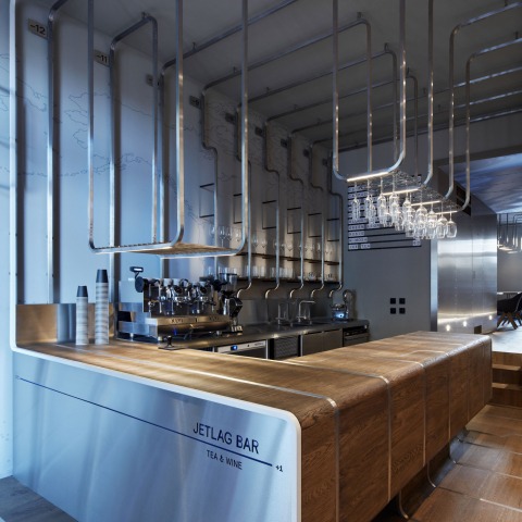 Mimosa architekti proposed a design developing an space concept travelling through time zones derived from its name "Jetlag." "The curvature of real time zones is generalised in the bar morphology. Each zone begins and terminates with a curve delimiting the space part of concern."