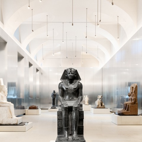 In contrast to Dante Ferretti’s black box design, the original architecture of the monumental statuary – dating back to the 17th century – has been fully uncovered, revealing the vaults and high windows characterizing the space. The statues can be bathed in daylight, as they were in their original context at Karnak. Subtly reflective aluminum walls display historical information about the statues, while lending an ethereal quality to the gallery space. Light streaming through the clerestory windows directs visitors' gaze towards the airy space above, evoking the grandeur of the Baroque architecture, while subtly reminding them of the statues' contemporary setting in Turin.