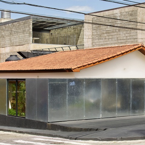 TPBA Agency + CLUBE added a folded metal wall to the original structure, which redefines the perimeter of the plot and divides it into two parts, the first consisting of an extension of the existing garden terrace and the second, a new open space to link "Jacó" with the city through a small public square.
