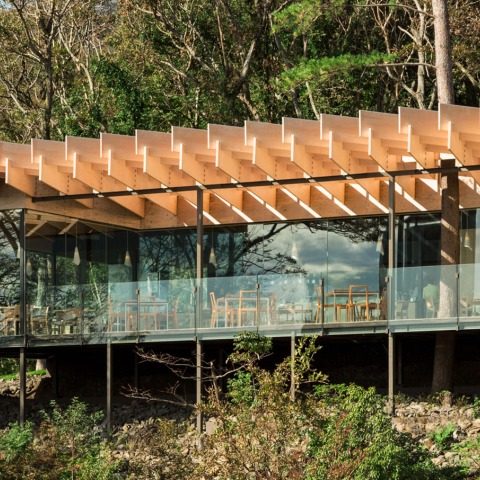 The best way to connect it to its hilly site was using a hybrid wood-steel frame; supporting the roof with cypress planks spanning up to 11.4 meters, with the restaurant main body constructed from glass, allowing views of the surrounding landscape Sagami Bay.