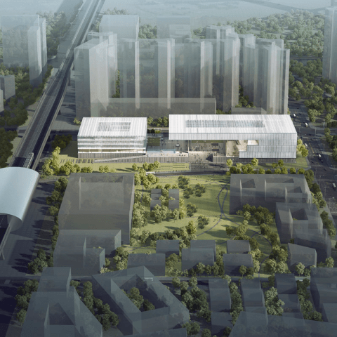 The design by KSP Jürgen Engel Architekten consists of three elements, which together form an ensemble: an art museum, a library and archive, and in the middle a public space, the 'Culture Plaza'. The Museum of Modern Art has different-size spaces, in which art can be displayed across an exhibition area that covers approx. 15,000 m². The library, whose footprint, like that of the museum, measures 80 x 80 meters, features a four-storey reading room with approx. 1,000 desks. The international architects' competition for the cultural complex was held by Shenzhen Art Museum and Shenzhen Library.