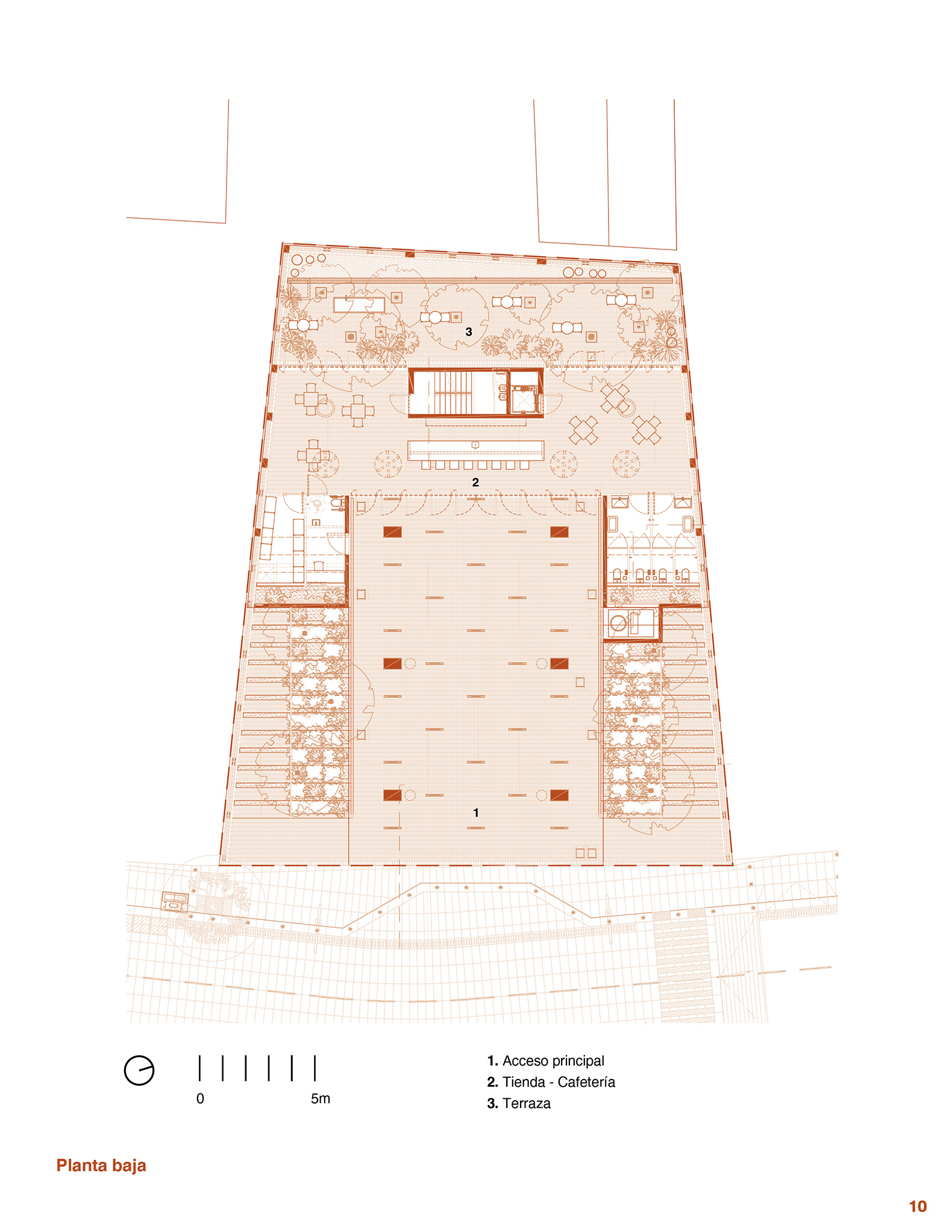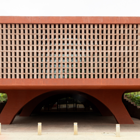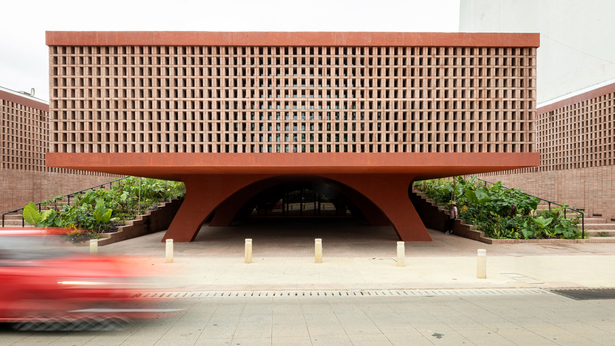 The project's materials are predominantly reinforced concrete with red pigment, visible in the structure, which is complemented by latticework and floors made of clay, glass, and wrought iron. This palette also incorporates endemic vegetation from the banks of the Grijalva River, integrating the project with its urban context.