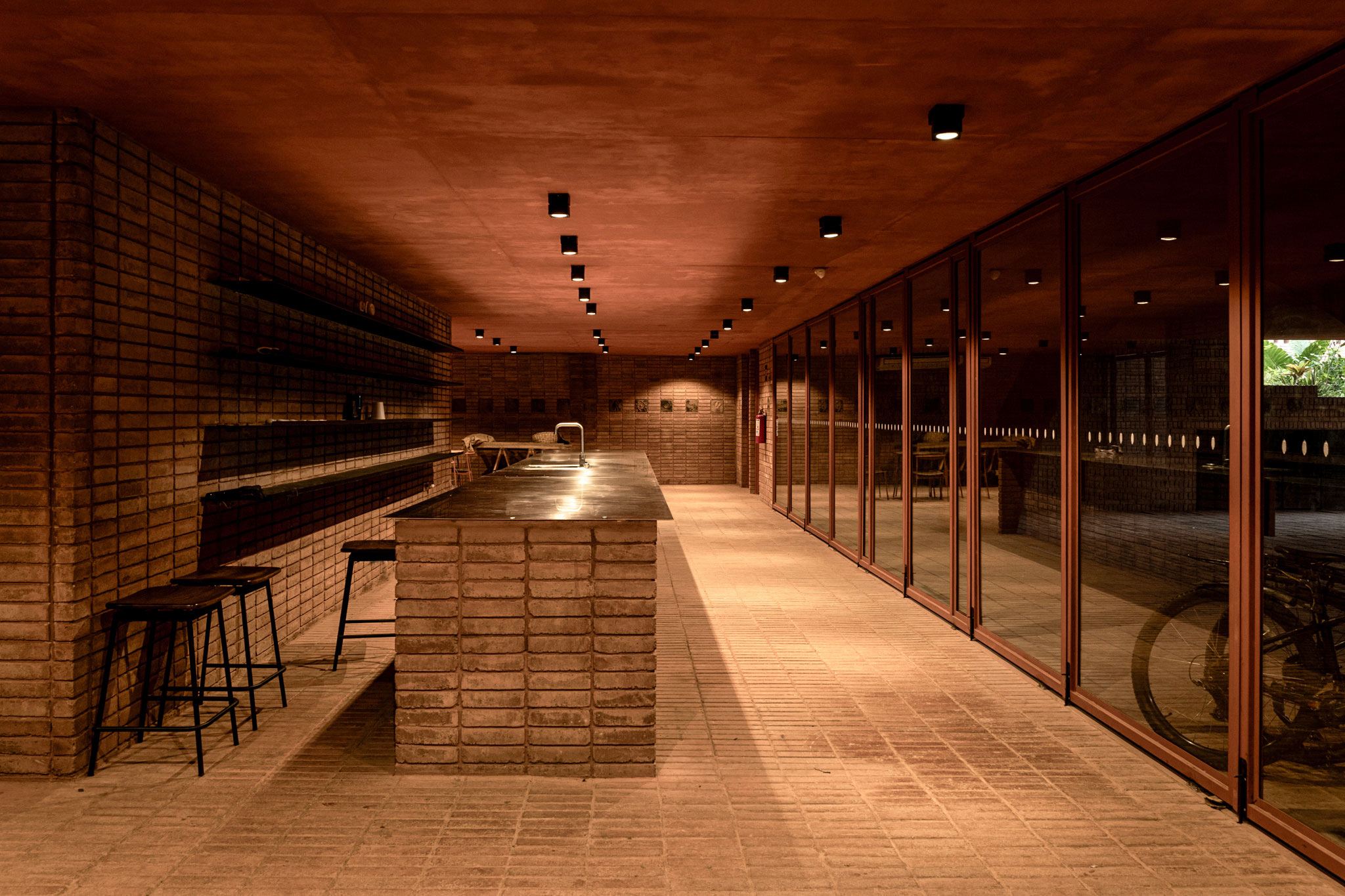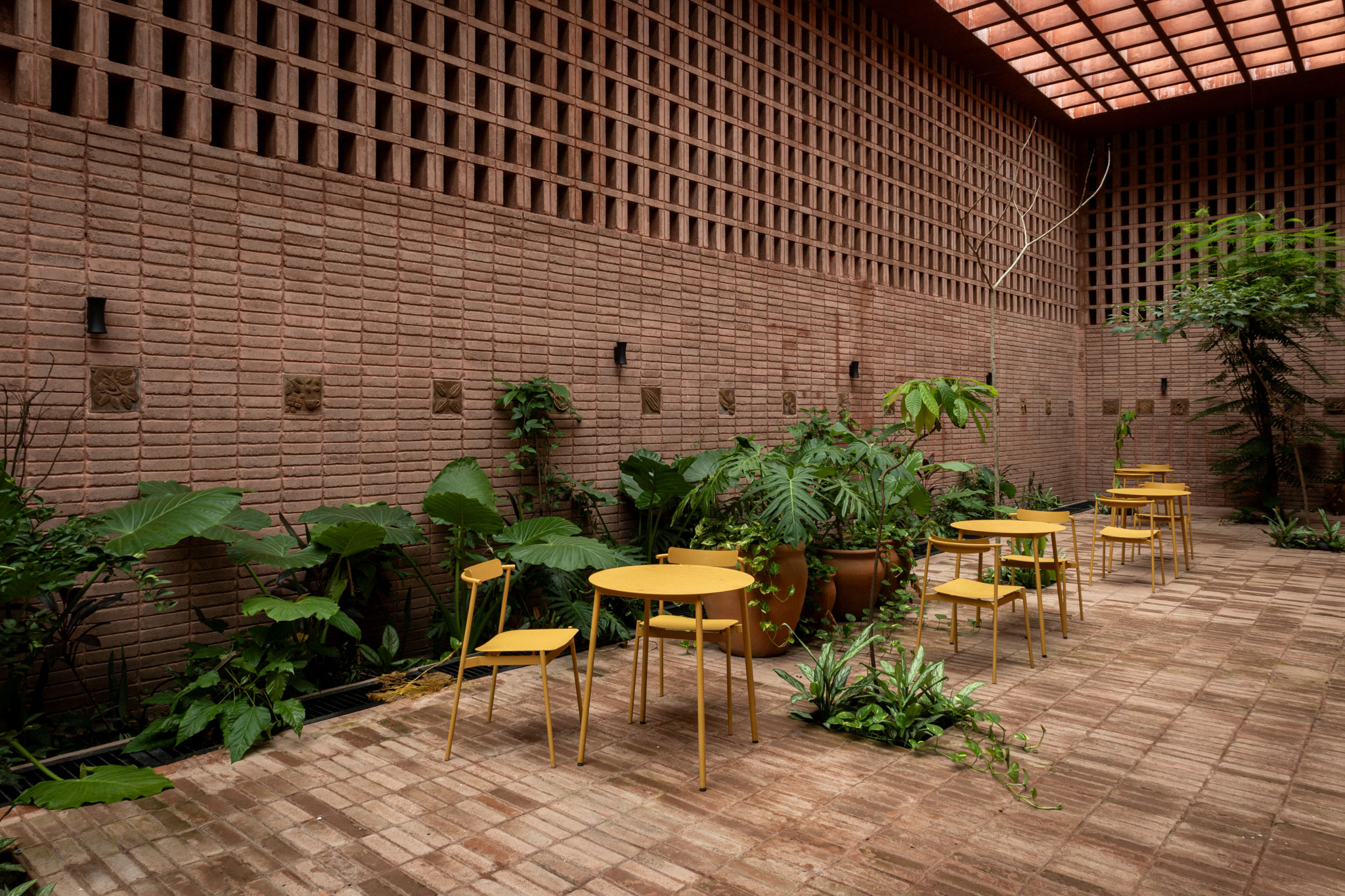 For the structural construction of the project, a system of slabs with wooden beams and planks was used on a painted steel frame. In terms of materials, reinforced concrete with red pigment predominates, complemented by latticework, clay floors, glass, and wrought iron.
