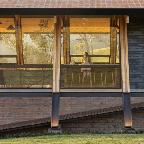 Since most of the house is on the upper floor, a ramp provides direct outdoor access, allowing you to walk around and enjoy the view. Located on one side of the house, this covered outdoor walkway creates a smooth transition between the interior and exterior. The house's connection to the natural environment is also evident in its functionality. A set of solar panels provides electricity, and gray and black water is treated using grease traps, a biodigester, and a wetland. After passing through a small lagoon, the water is infiltrated to the ground.