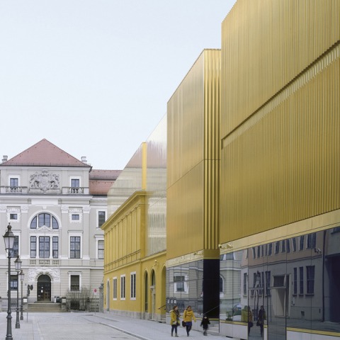 Peeling away the unnecessary historical accretions, a 1972 extension has been removed to reveal the wall of the original villa, which has been sympathetically restored in ochre render. The different historical elements are then unified along Richard-Wagner Street by a new gallery pavilion, containing two levels of exhibition space. The new building is intended as a ‘jewel box’ for the treasures of the gallery – it is clad in metal tubes of an alloy of copper and aluminium, their colour and form designed to complement the villa’s rich ochre hue and textured facades.